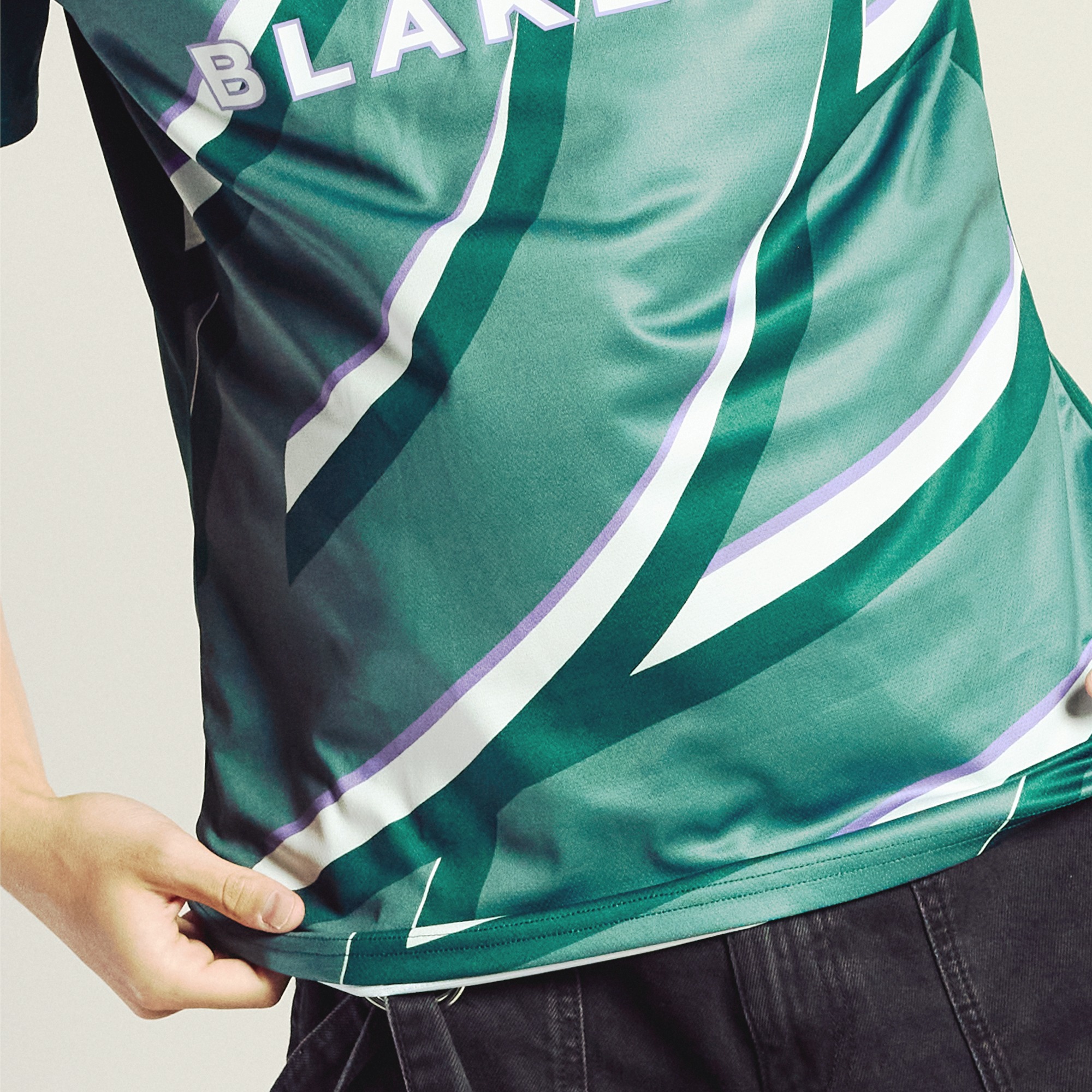The jersey is made entirely from recycled polyester and is paired with matching rainforest green shorts and socks.
