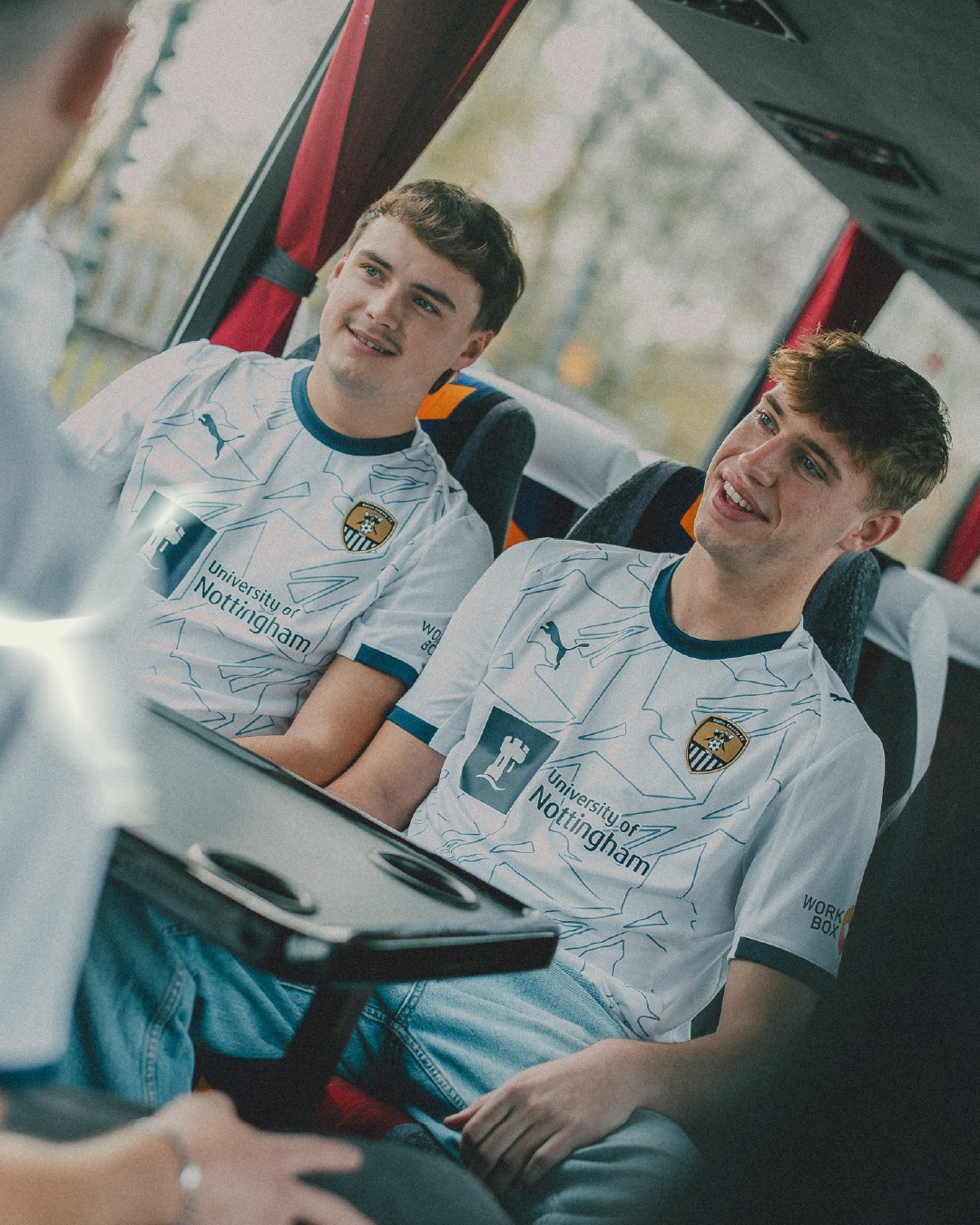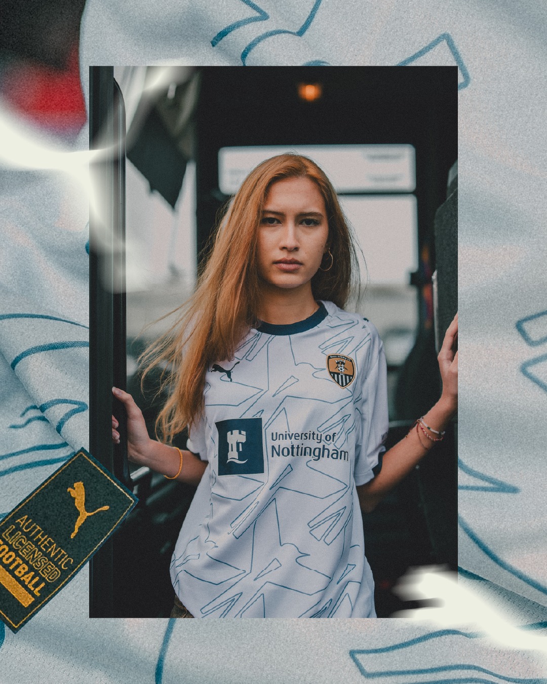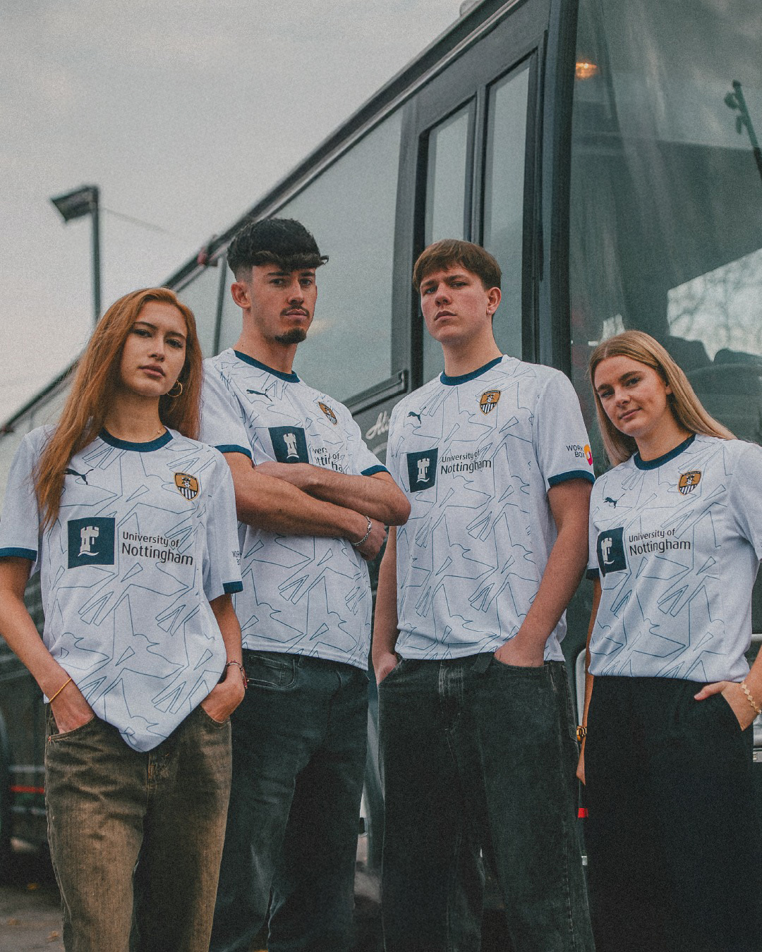 The Notts County jersey is produced by Puma and uses DRYCELL performance technology to move moisture away from the skin. It is made from at least 95% recycled polyester sourced from textile waste and reused materials. The University of Nottingham appears as the primary sponsor across the chest, with additional branding on the sleeve. The fan shirt is a limited edition release with priority purchase windows in place.
