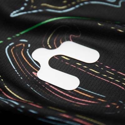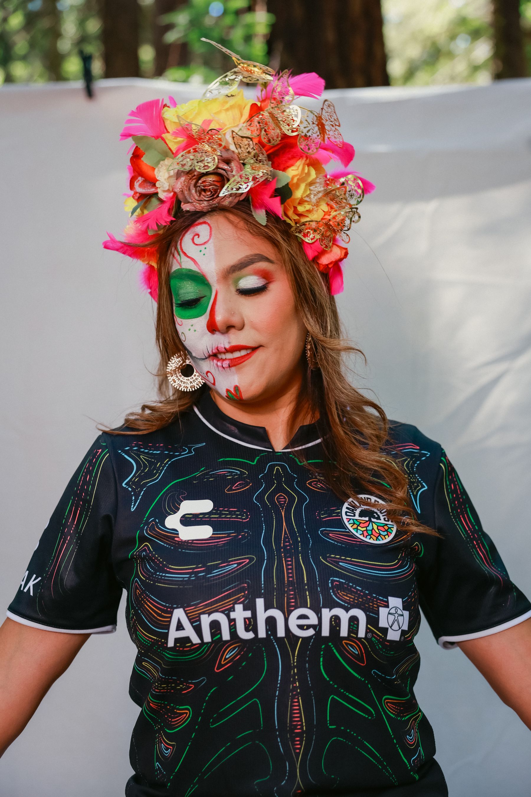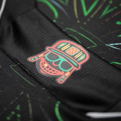 The shirt has a black base and features a colourful skeletal design, inspired by traditional mosaic art, symbolising the deep connection to Latin American heritage and ancestors. A small Los Rakas emblem is positioned below the collar on the back.