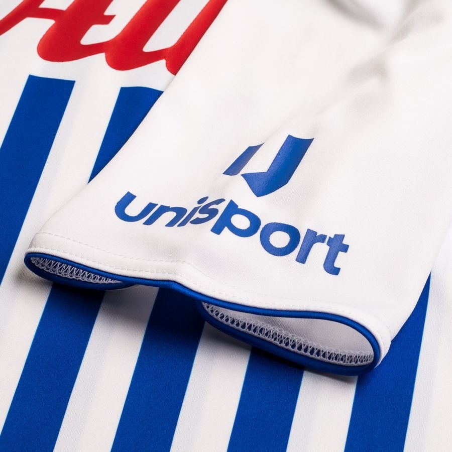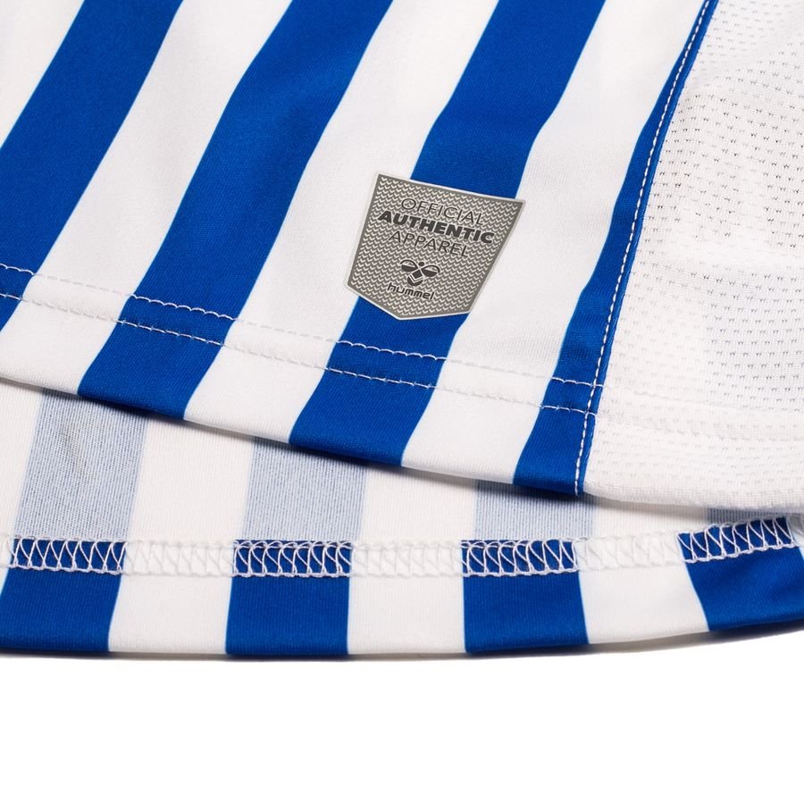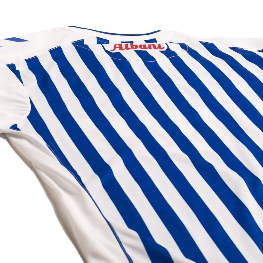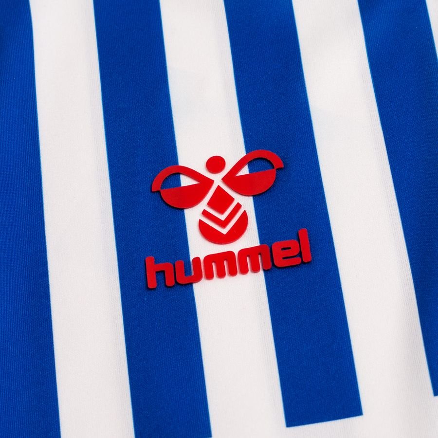 A twist on the famous blue and white stripes - much thinner than usual here, and confined to the trunk - the Hummel design also sees partner branding appearing in red, as well as the blue chevrons.