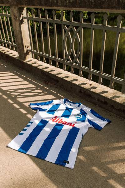 Blue Hummel chevrons run along the sides of the torso of the shirts, which will be paired with blue shorts and white socks.