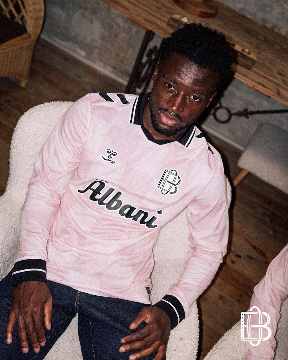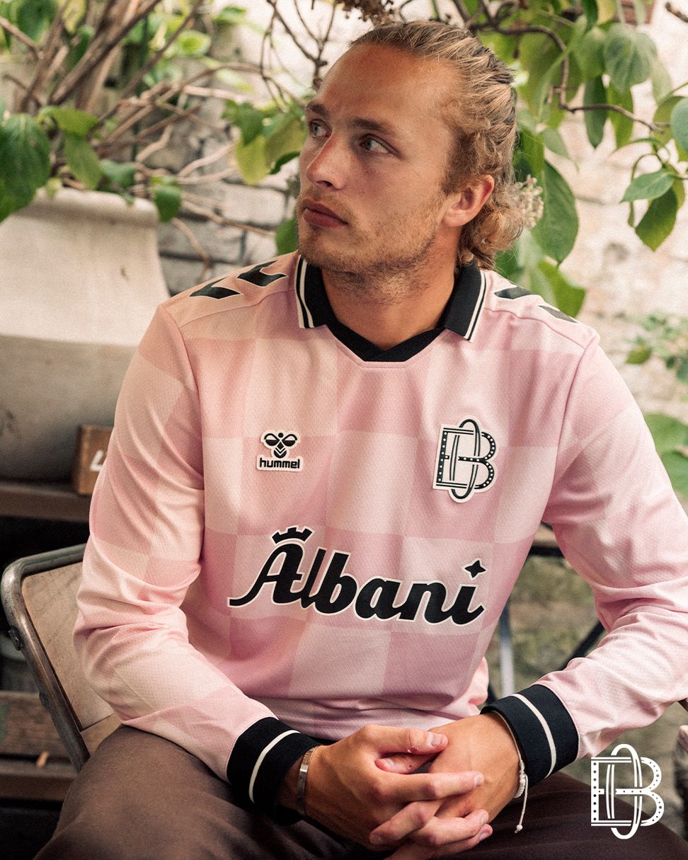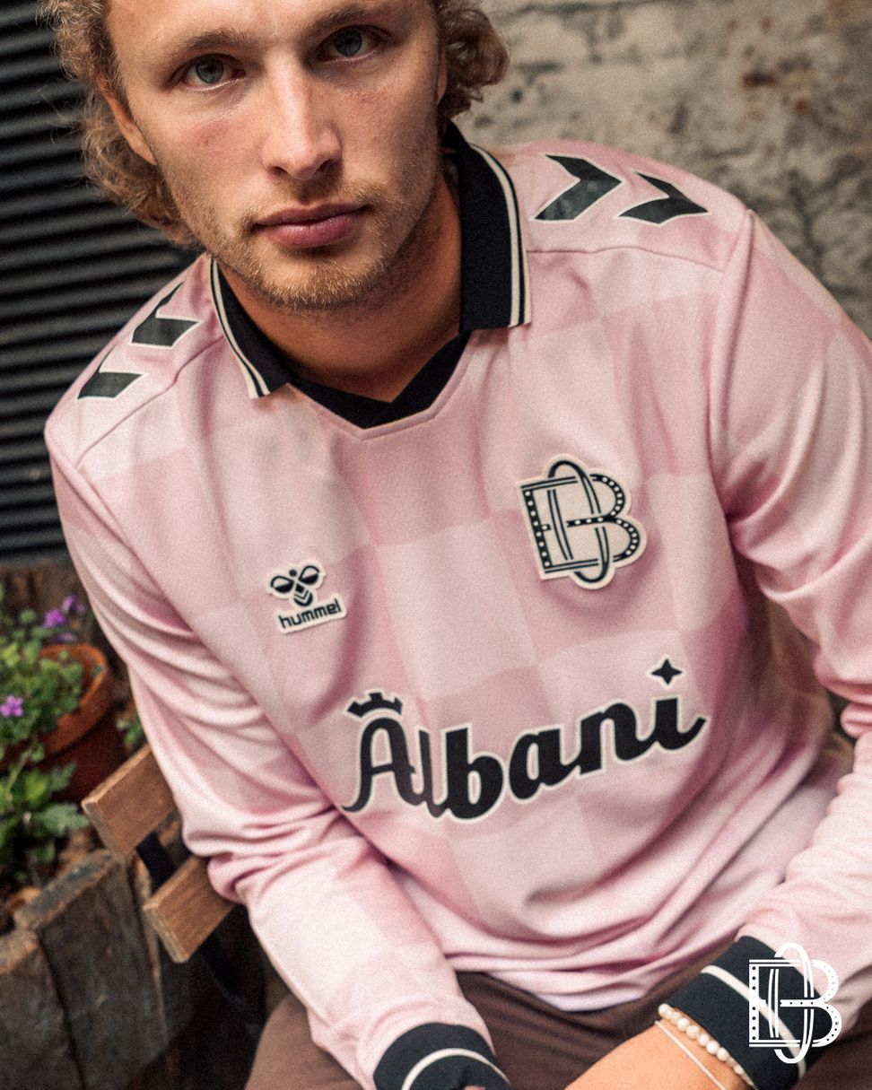 The jersey comes in a pale pink base with tonal chequered squares across the body, with a black collar and cuffs detailed with thin white lines. The historic crest sits on the chest in monochrome, placed opposite Hummel’s logo, while black chevrons run across the shoulders. The Albani sponsor is displayed across the front in bold lettering.