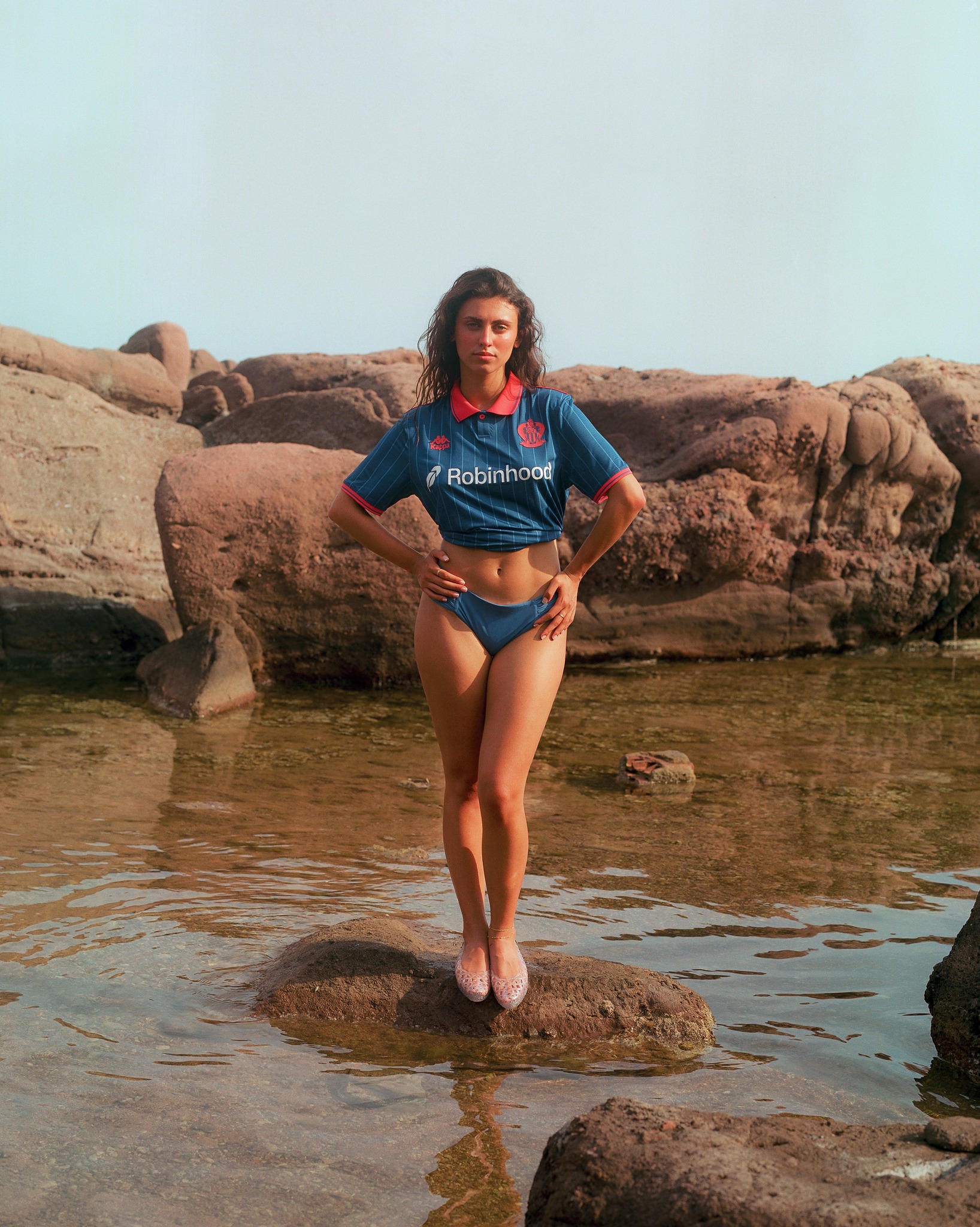 The kit is completed with matching blue shorts and socks featuring terracotta accents, and forms part of a wider capsule collection that includes a t-shirt, jacket, and bag in the same colour palette.