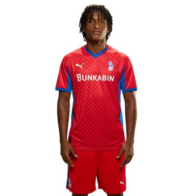 Constructed from more than 95 percent recycled materials and incorporating Puma’s dryCELL technology, the shirt is designed for breathability and sweat-wicking comfort, and will be paired with red shorts and socks, both featuring blue detailing.