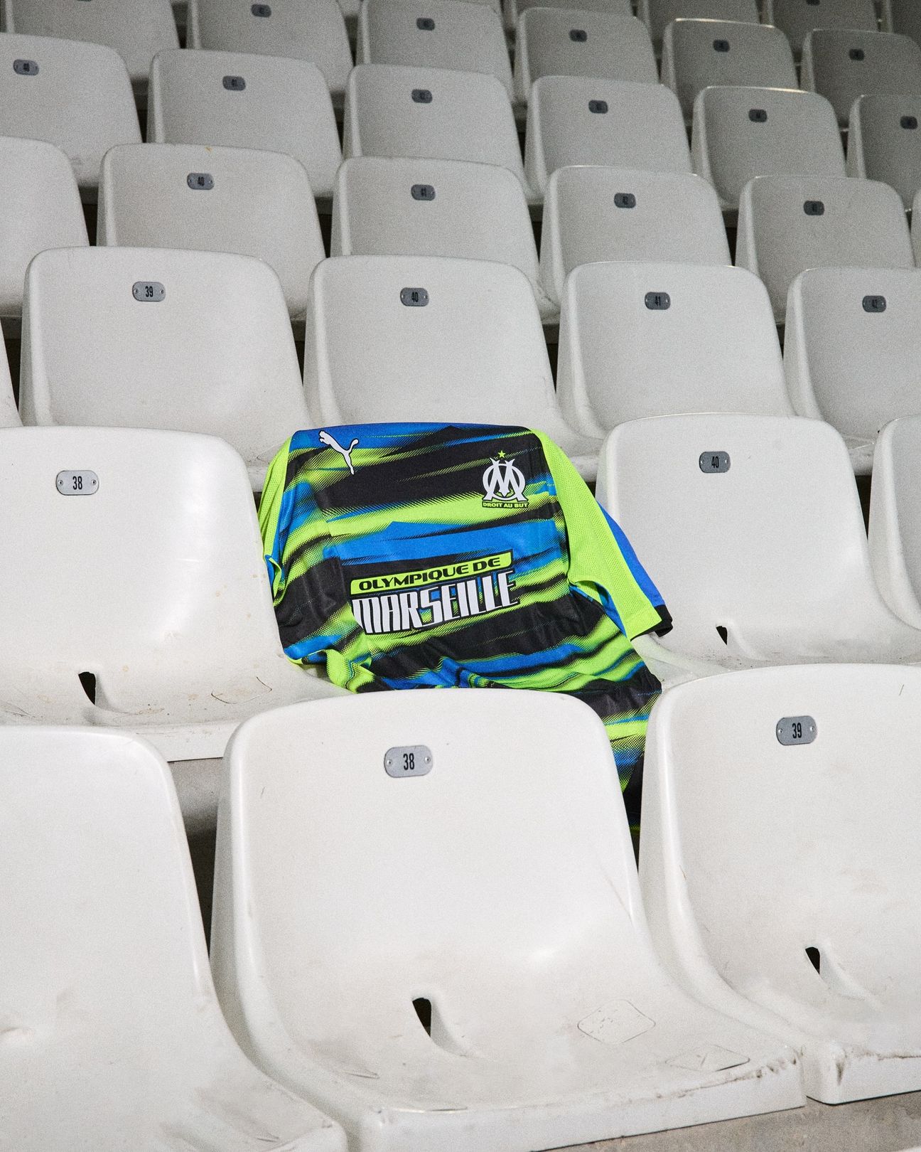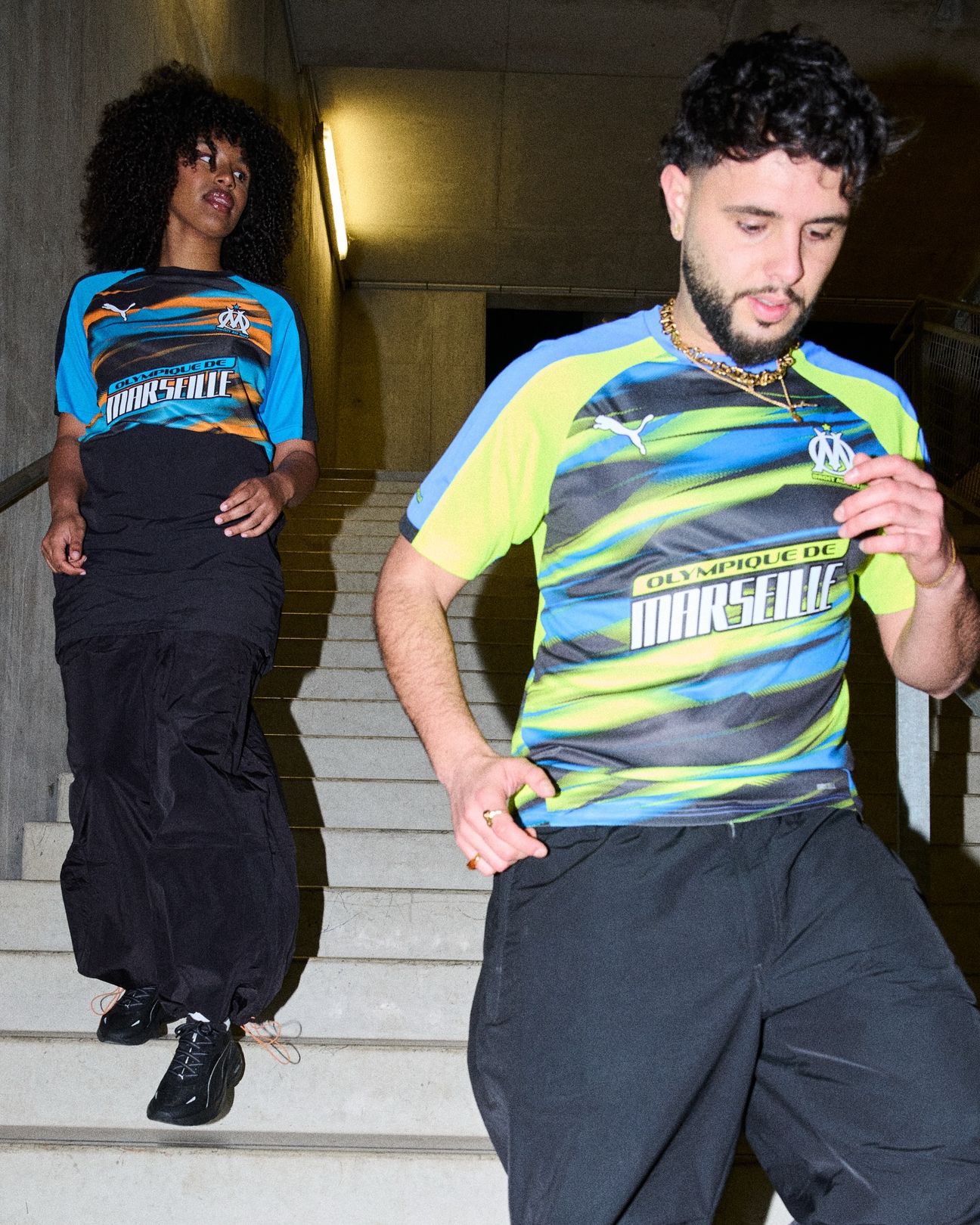 The "Faster Marseille" shirts feature a dynamic design with sharp graphic patterns symbolising speed and movement. The collection includes three colour variations; blue, orange, and yellow, each incorporating elements inspired by Marseille while maintaining a performance-driven style.