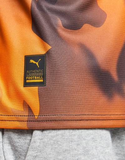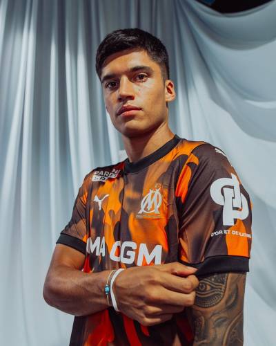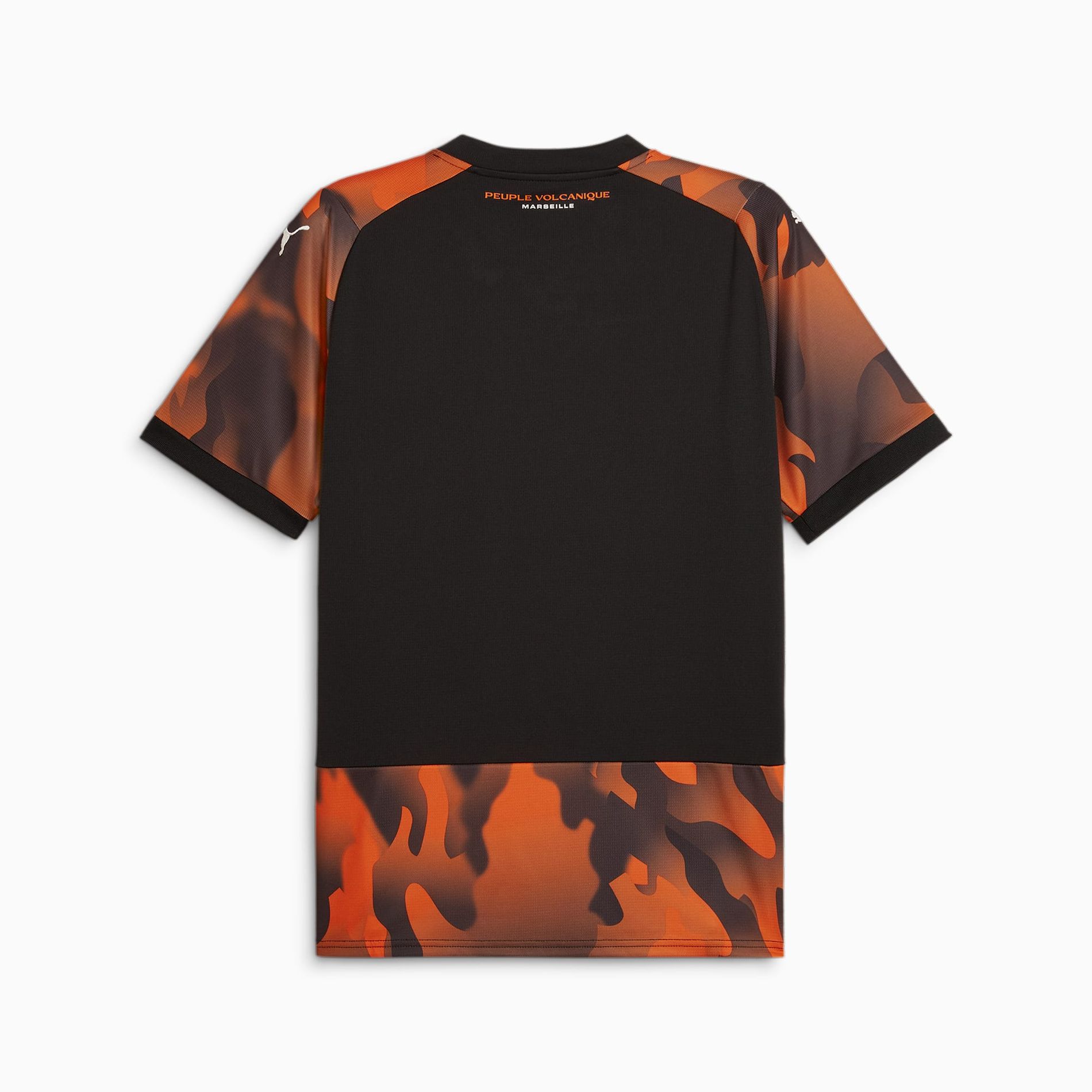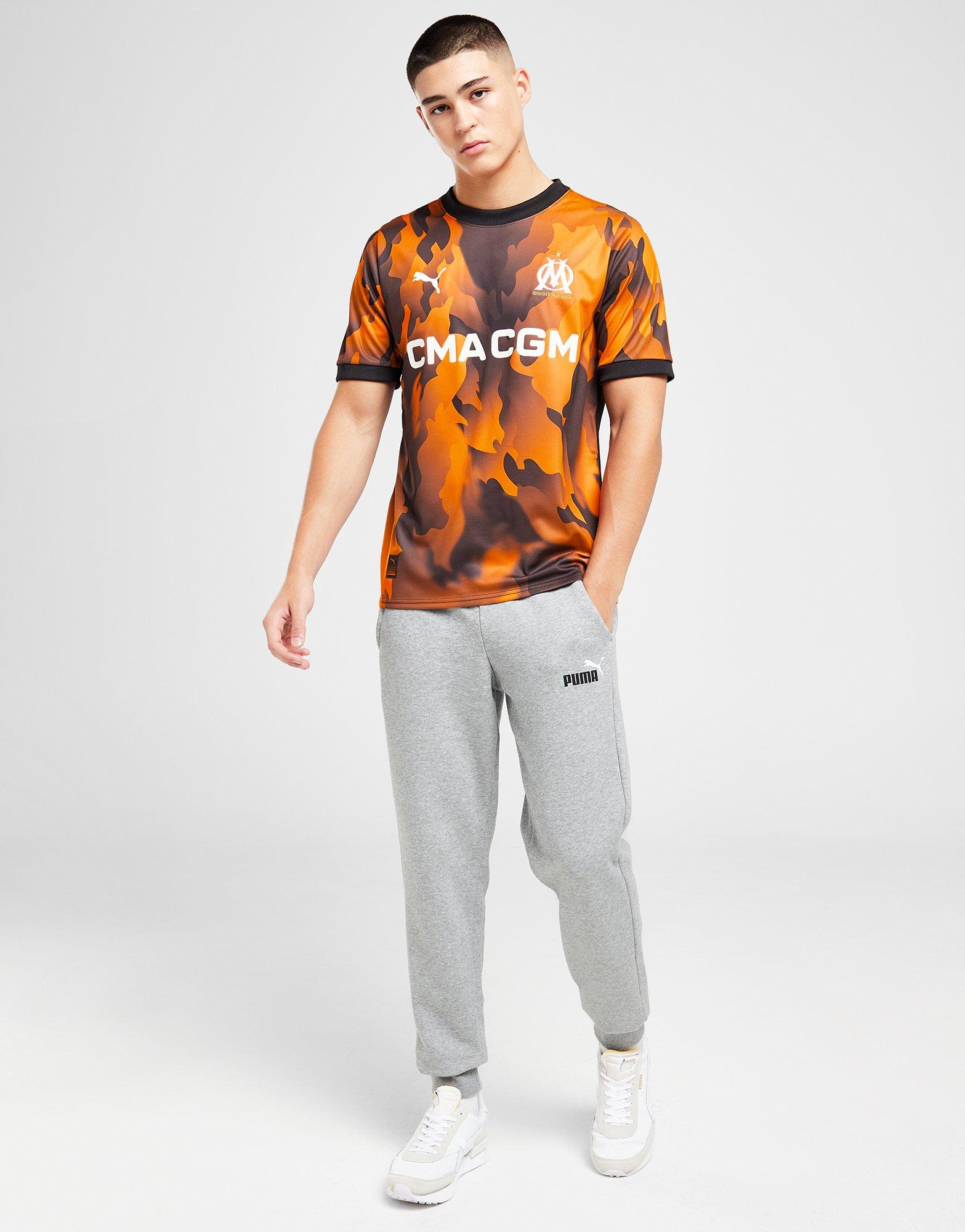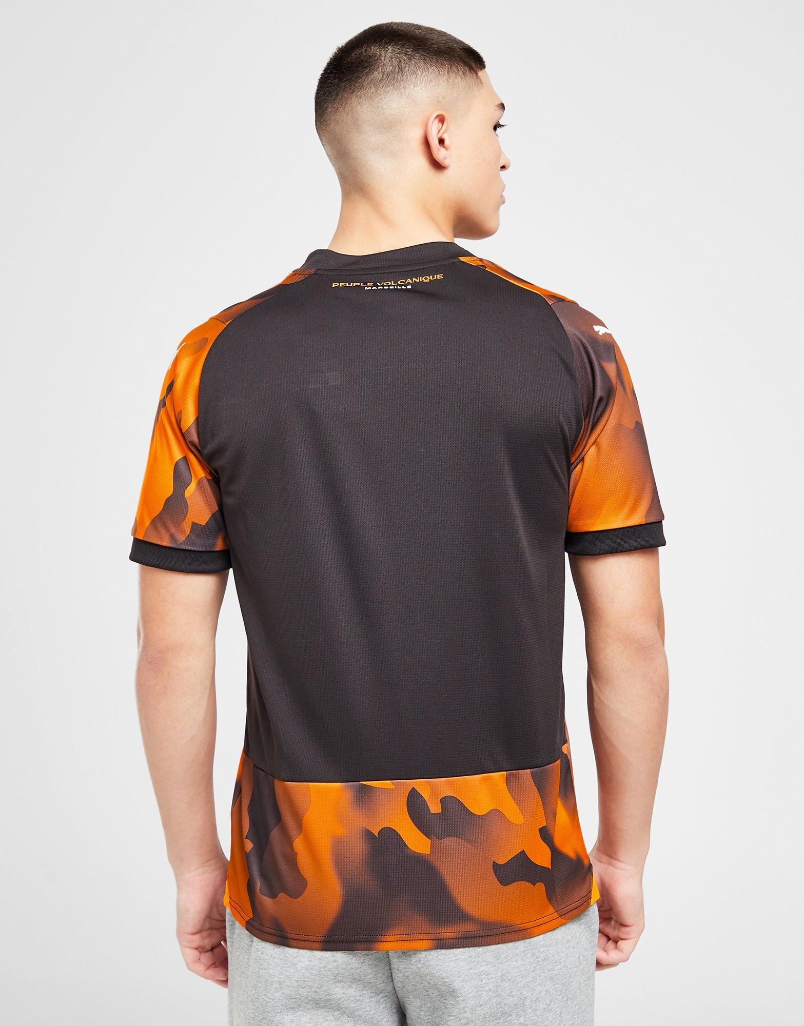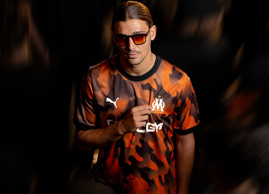 Debuted in the Ligue 1 draw away to FC Nantes, the 2023-24 secondary-change release for giants of French football “OM” is in “PUMA Black”, “Flat Dark Gray” and “Rickie Orange” and has a fiery graphical design “inspired by the crazy atmosphere of the Vélodrome [stadium]”.