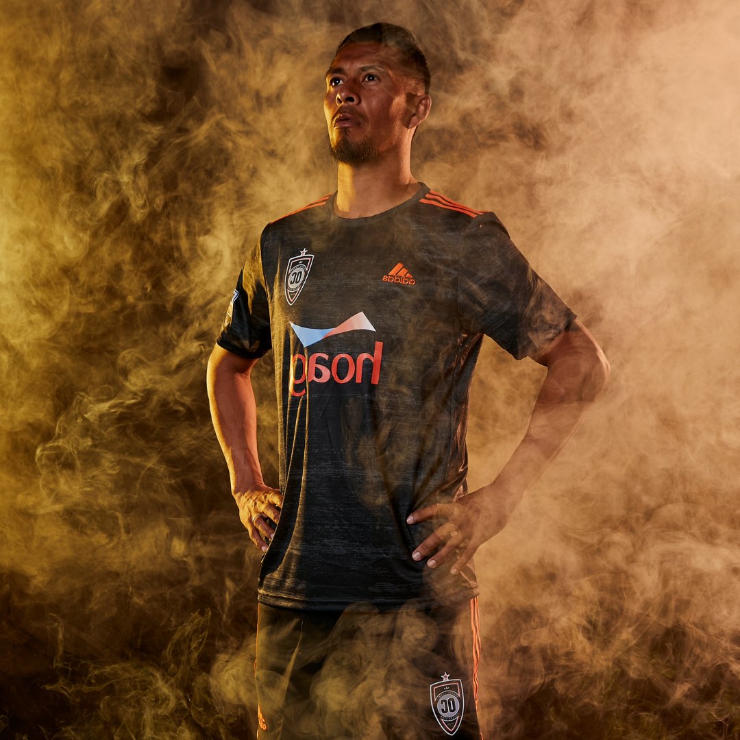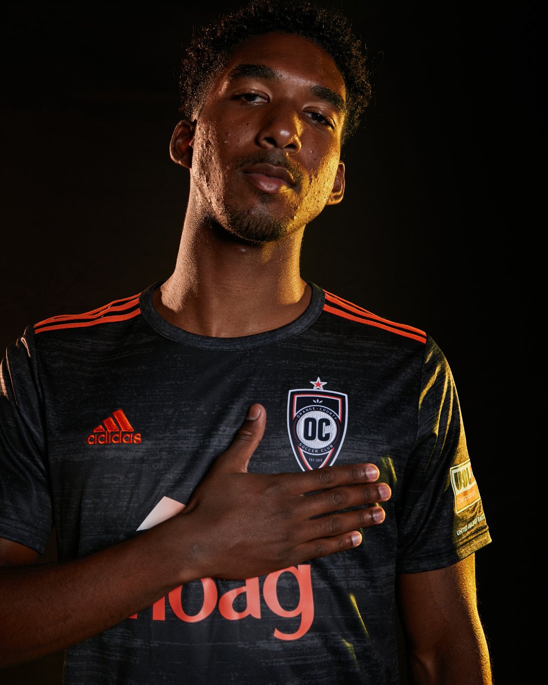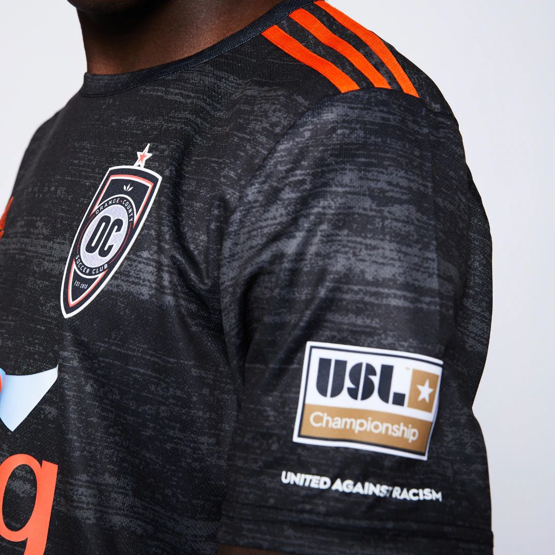 The black Dusk Kit, features the sponsor logo on the centre with the OCSC crest on the left chest, league patch on the sleeve, and "United Against Racism" under it.
