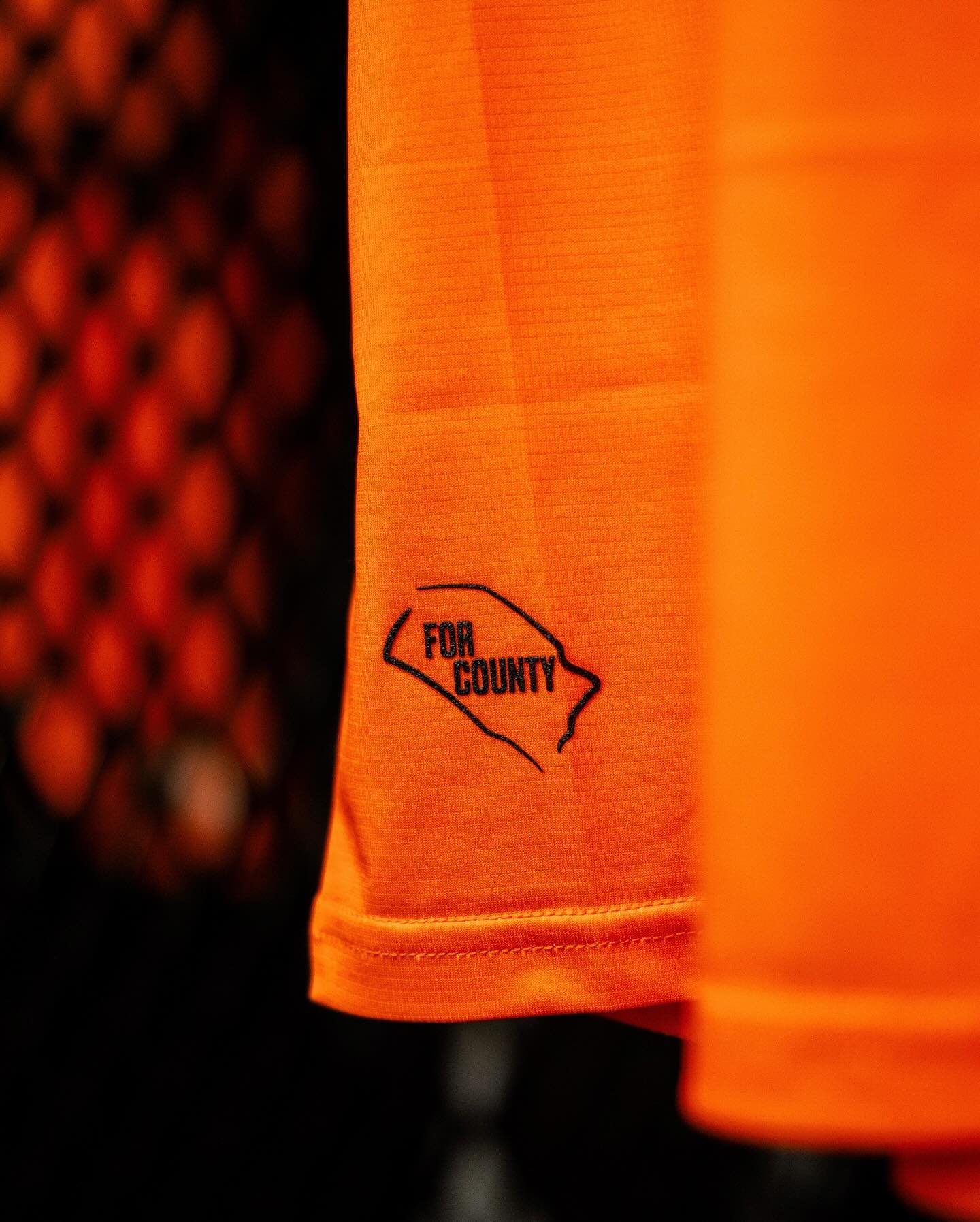 The kit also features the "For County" jock tag, consistent with the away and goalkeeper kits, positioned in black on the left hip. An appreciative message, "Thank You Fans!" in orange, is inscribed inside the collar, a tribute to the fans' unwavering support, notably during the 2021 campaign to keep the team at Championship Stadium.
