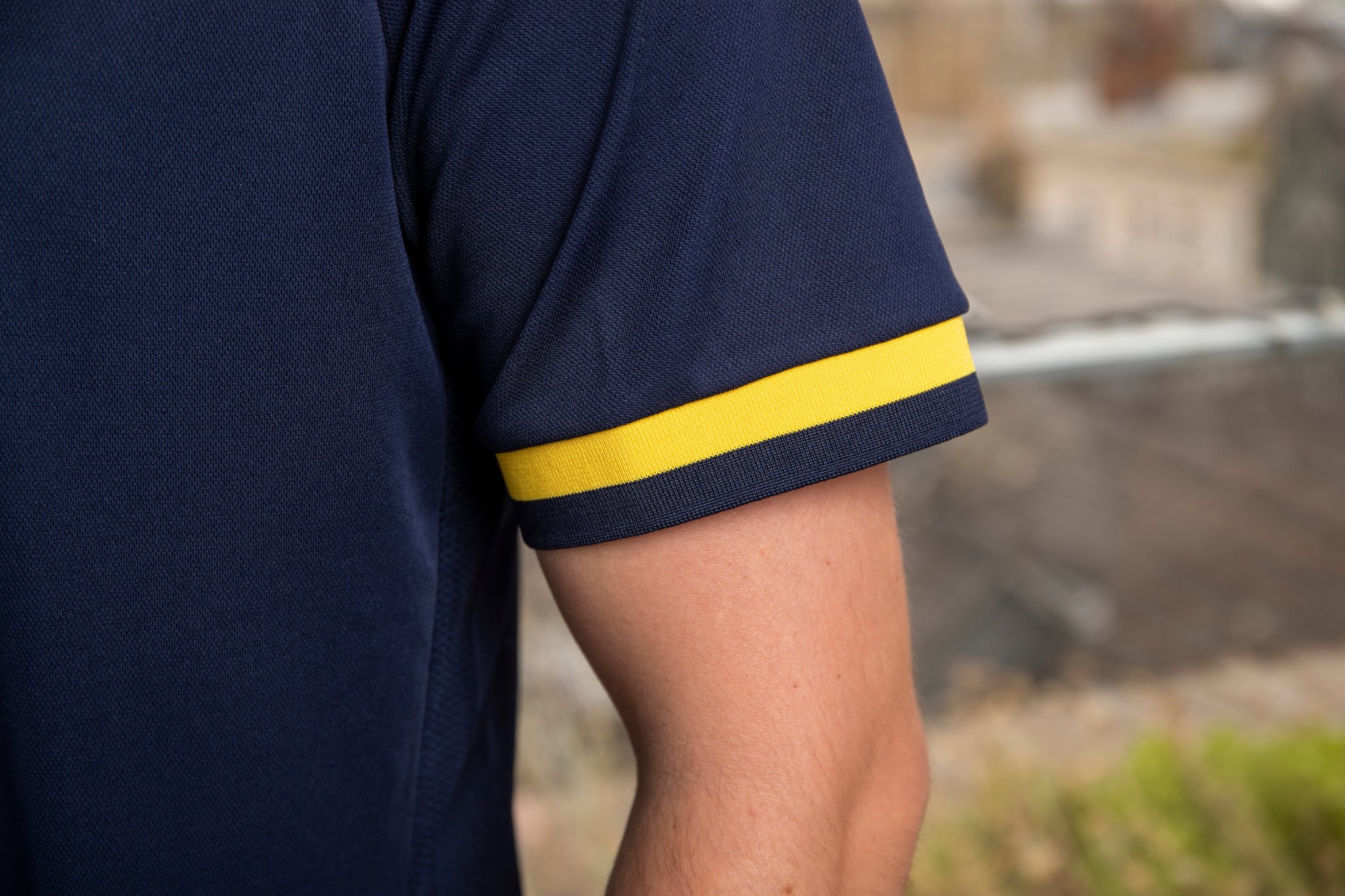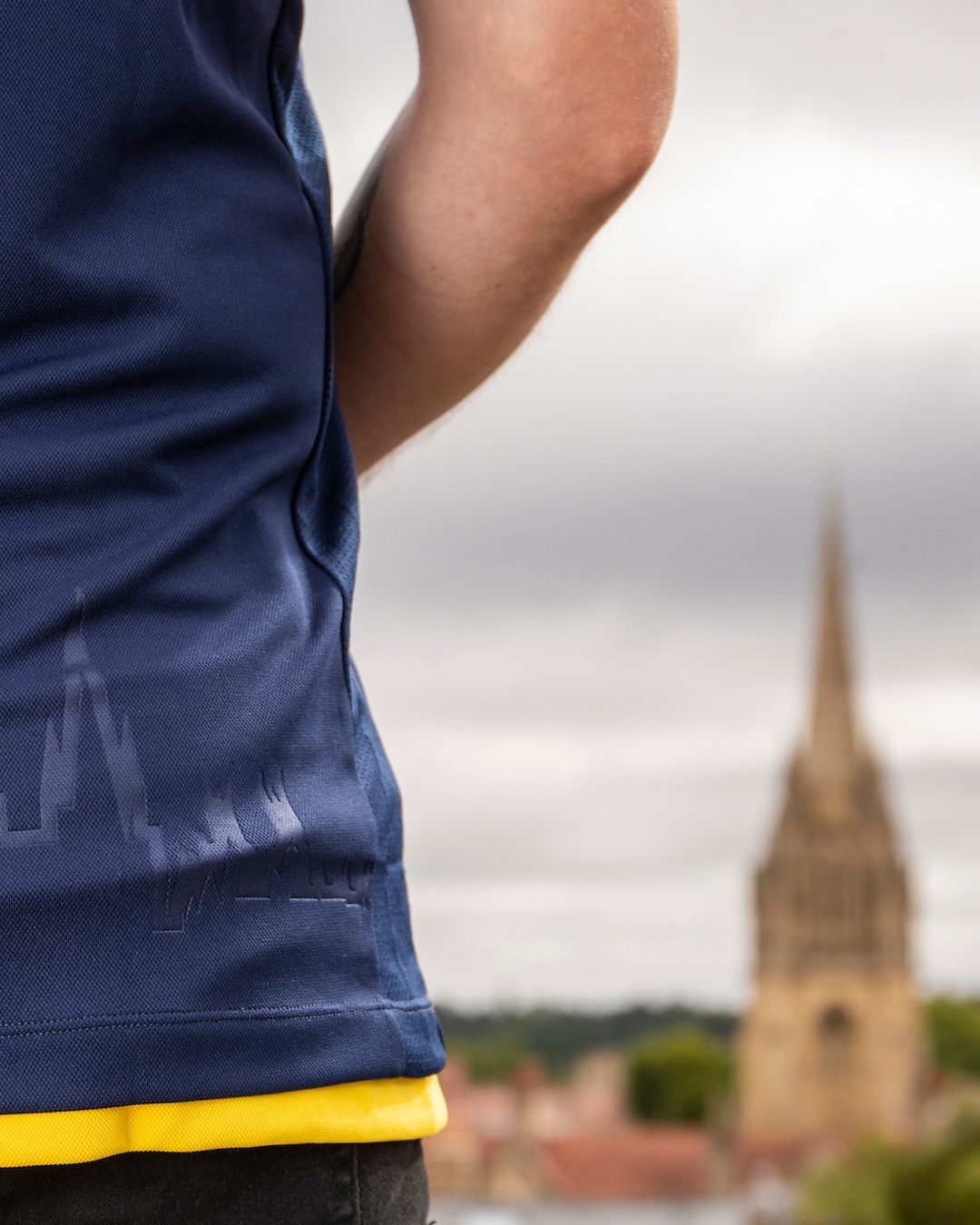 This year’s bespoke navy design by Macron has a striking yellow trim and streamline collar.