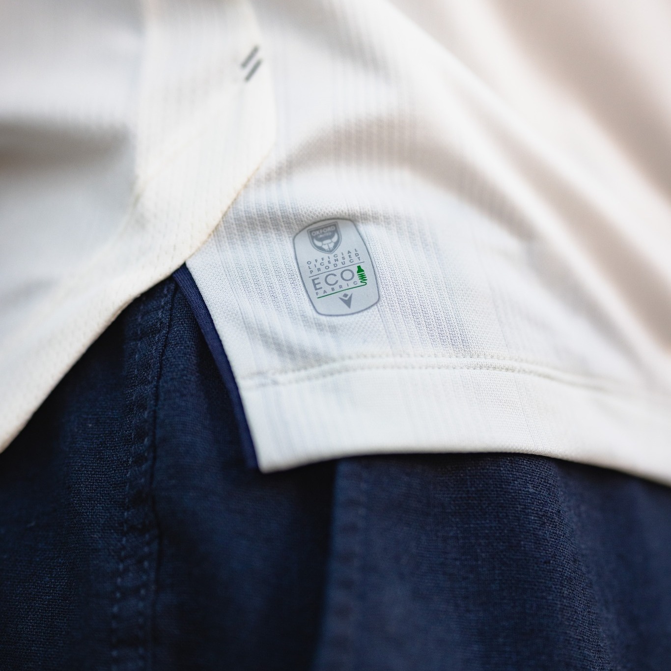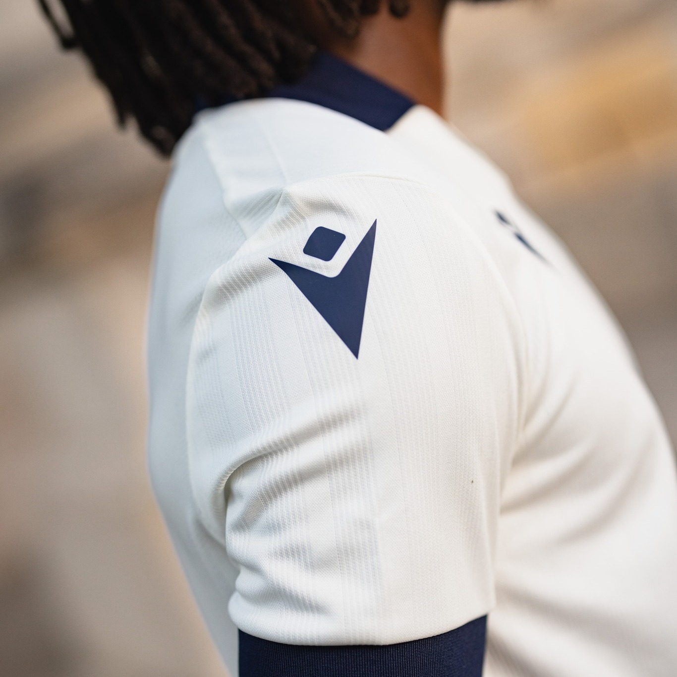 The 2024-25 primary-change release from Macron is in off-white with a subtle pinstripe effect and collar, cuffs, suppler “Hero” logos and main-sponsor branding all in navy blue.