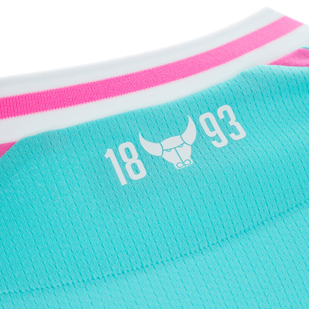 Subtle pinstripes are woven into the material, while the Club crest and Macron Hero are presented in high-definition monochrome silicone for a sharp finish. Pink and white accents feature on the collar, sleeves and trim, tying the design together.