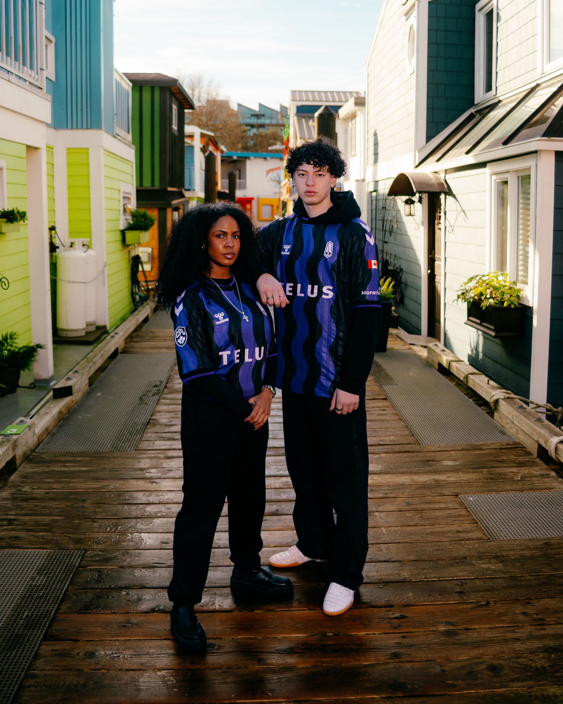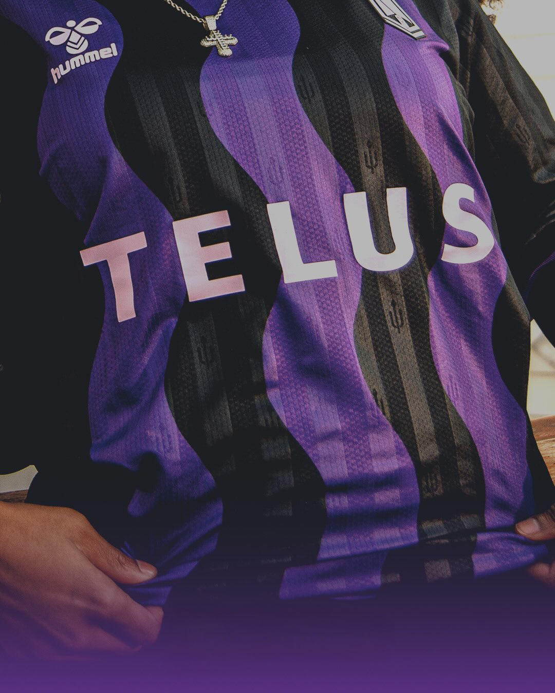 Sponsor placement sees TELUS across the front of the shirt, with further partner branding applied to the sleeves. The rear of the shirt includes space for name and number application, with additional sponsor placement positioned lower on the back.