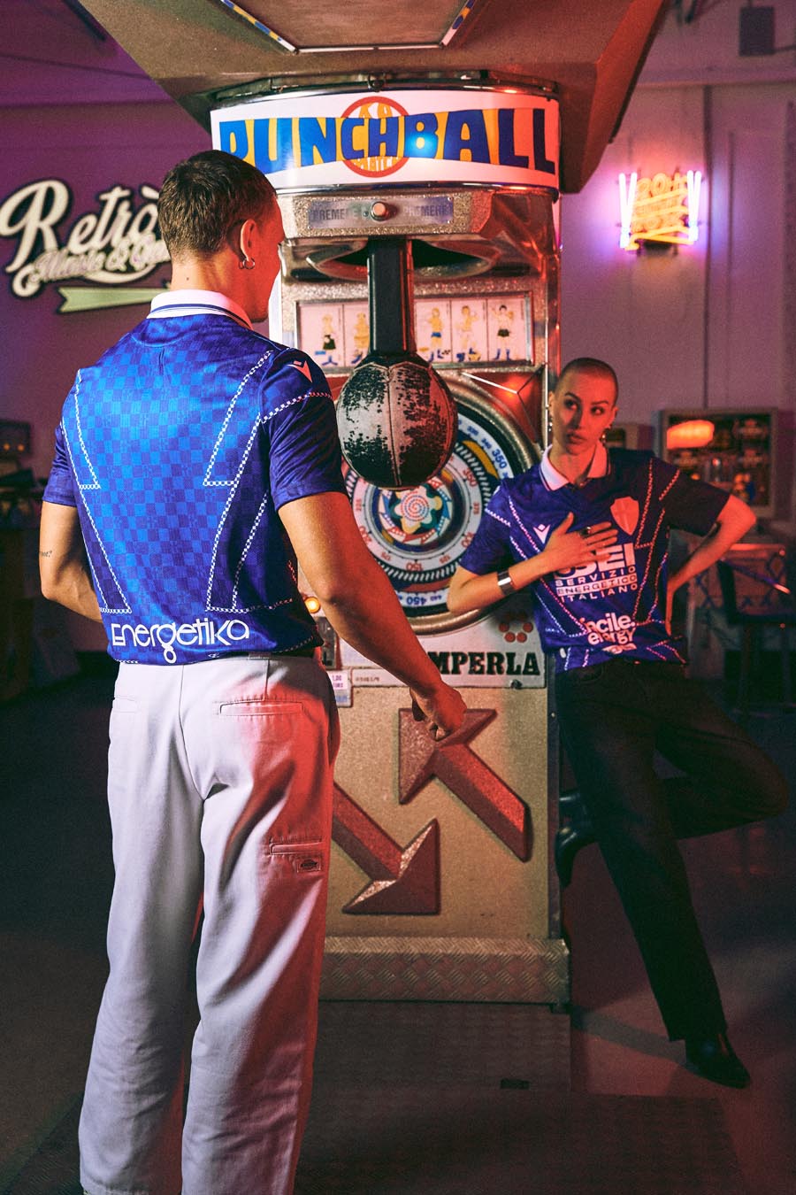 The Macron shirt is predominantly bright blue with darker blue panels on the sleeves and sides, finished with a knitted white polo collar featuring fine blue striping, and takes inspiration from 1980s and 1990s fashion.