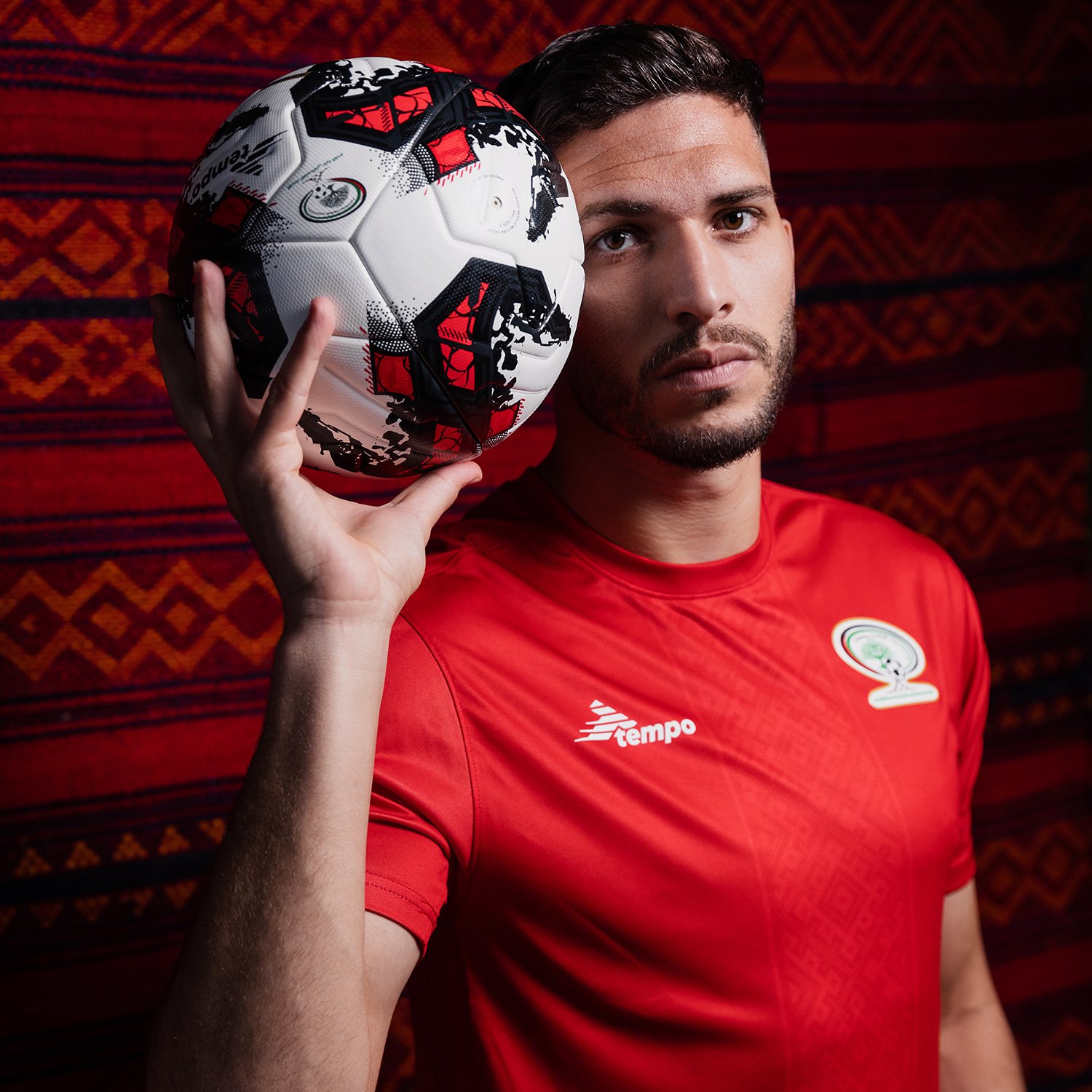 The 2023 first-choice release, produced by Tempo Sport, is in red with tonal patterning running vertically in the central portion and the crest is in full colour.