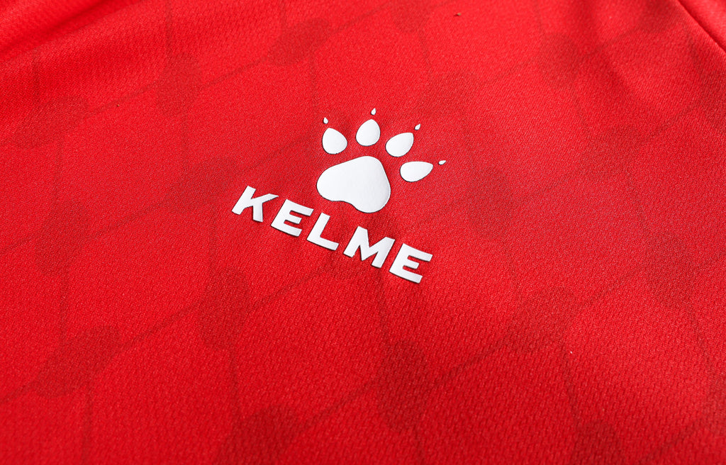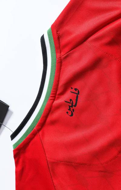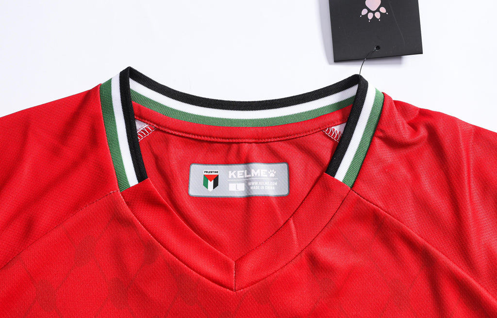 The new Kelme primary-change release is in red - with a subtle traditional Keffiyeh-scarf pattern - and the other colours of the national flag appear in the tri-coloured neck and cuffs.