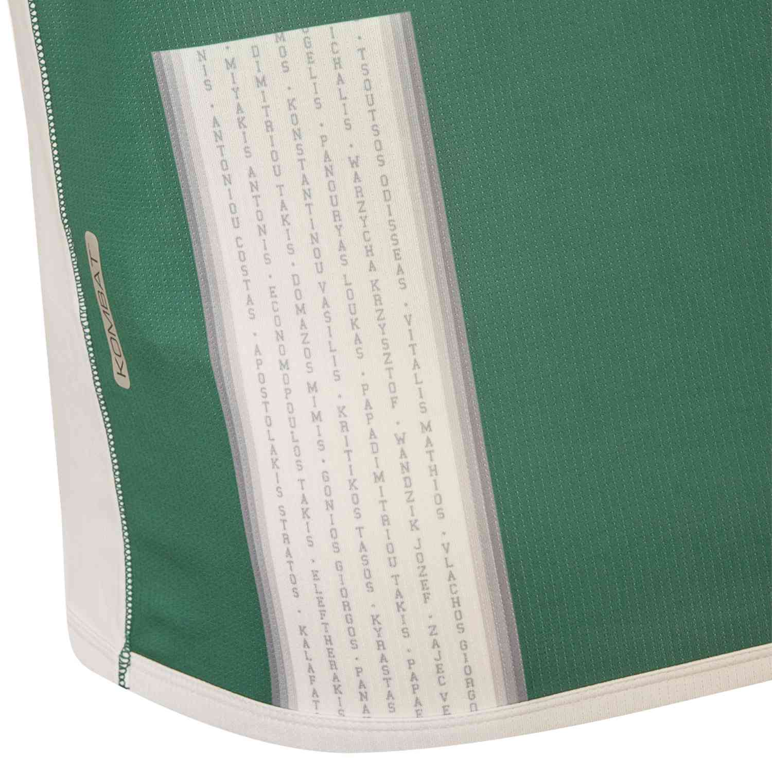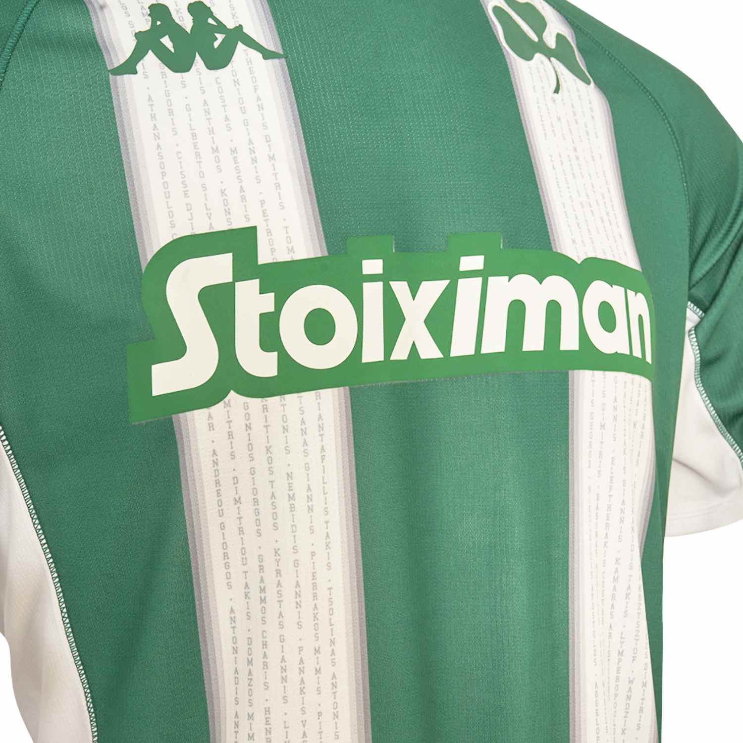 Sublimated in the fabric are the names of star players from the club’s history, while the Stoiximan sponsorship branding, while in a green which mismatches, is far less obtrusive than has been the case with recent examples.