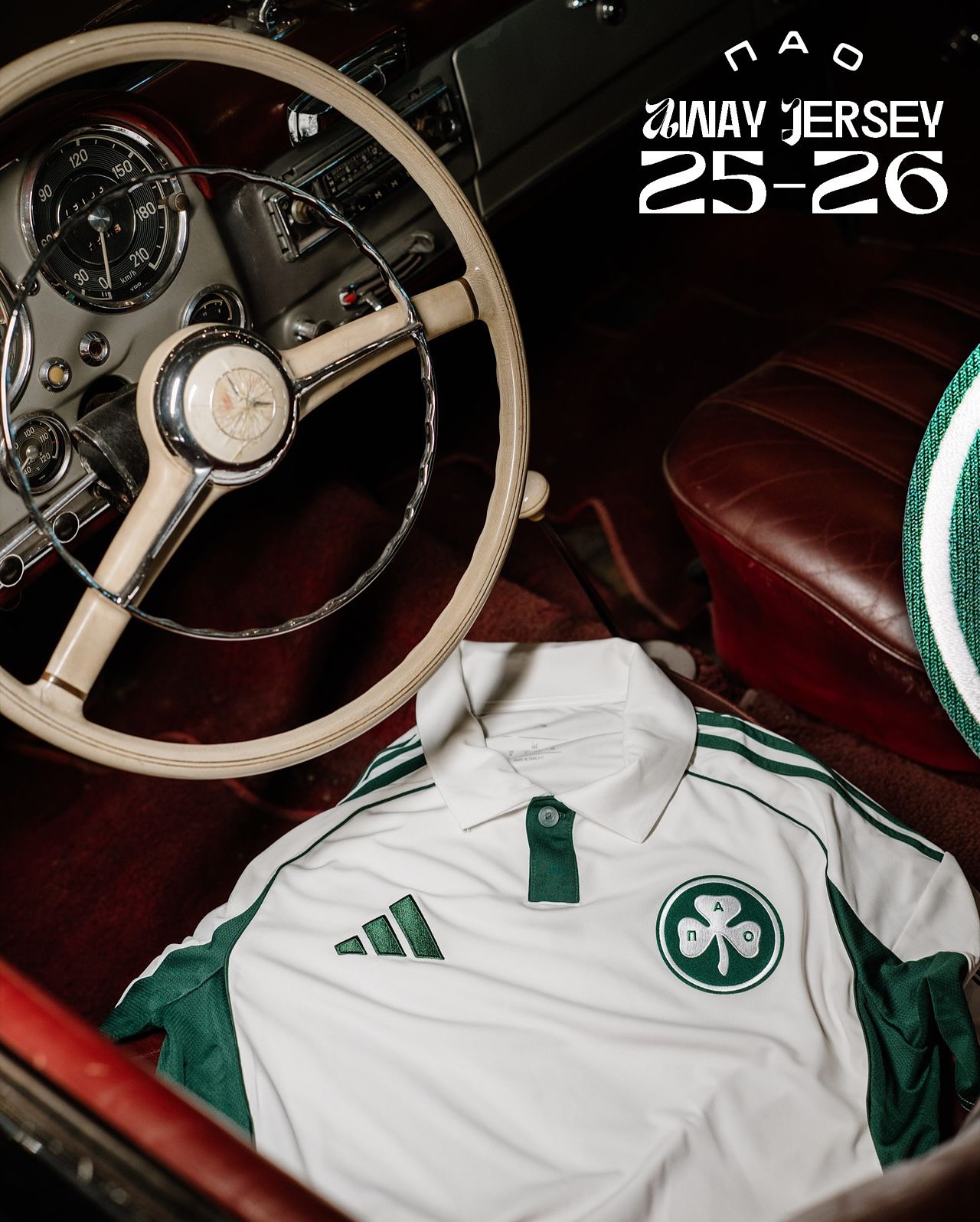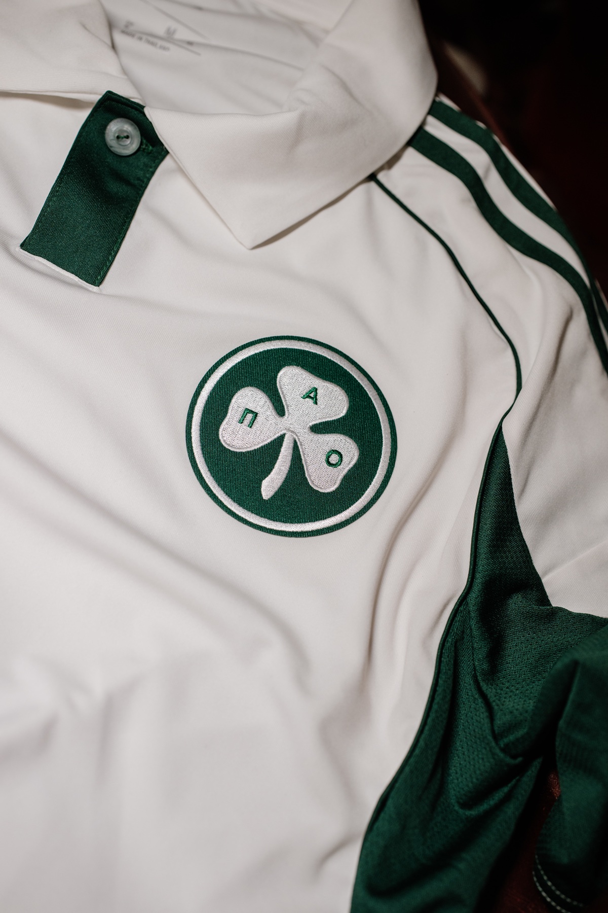Vintage-inspired elements include an embroidered clover badge on the chest, a retro collar and the “ΠΑΟ” script on the back in the classic typeface used during the club’s historic Wembley appearance in 1971, when Panathinaikos became the first and only Greek club to reach a European Cup final.