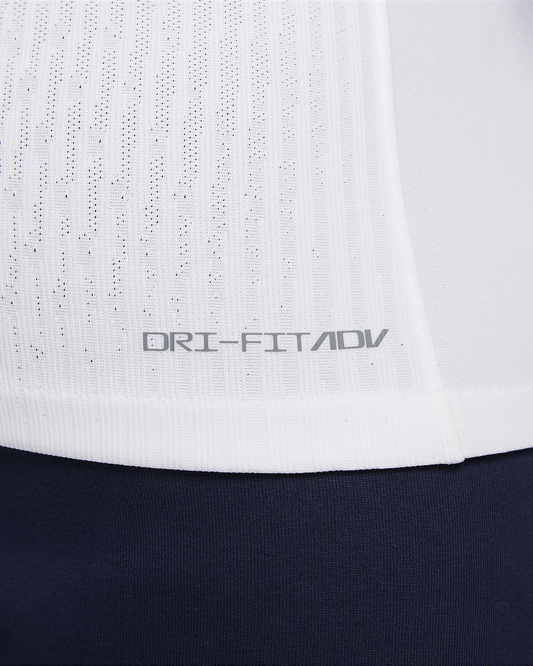 The crest is in full colour, partner/sponsor logos are in navy and the shorts and socks that complete the kit are in white for a nominally single-coloured overall look.