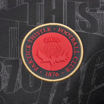 The shirt is black with a tonal sublimated pattern that includes the club’s name, nickname, and founding year, paired with a black buttoned collar. A red club crest with gold trim sits on the chest alongside the red O’Neills logo, with Partick Thistle and the year 1876 detailed in gold inside the collar.