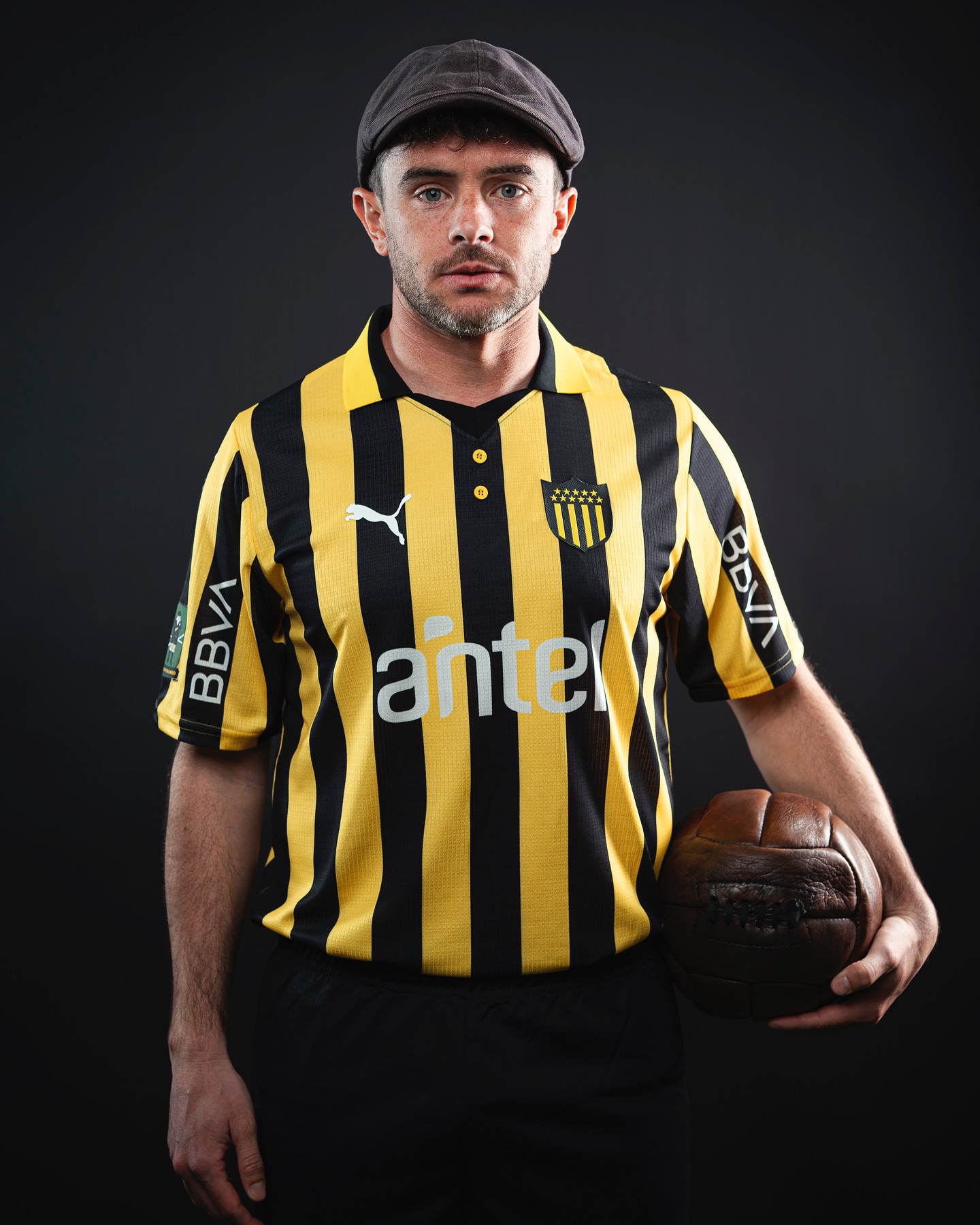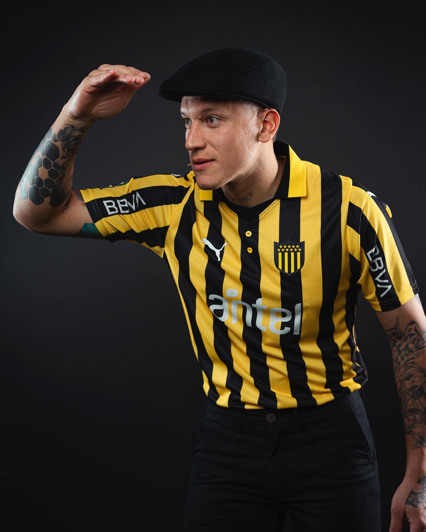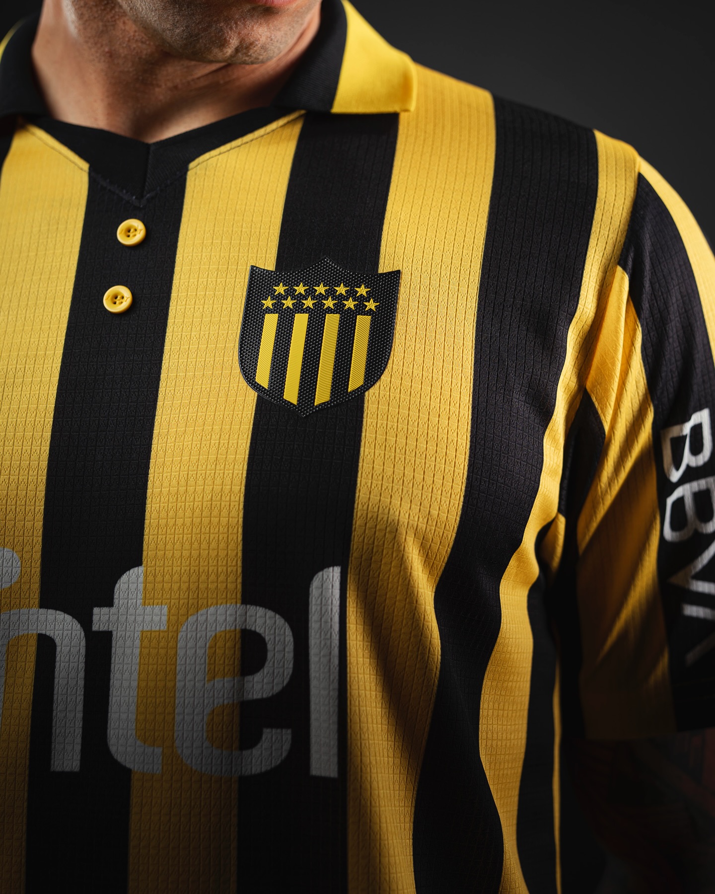 Partner logos are sublimated in white, the “Máquina de 49” (“Machine of ’49”) nickname appears on the upper back - stylised as “LA M49UINA” - on the right sleeve there is an image nodding to the Peñarol players and the officials waiting for the Nacional players to start the second 45, the crest is in standard colouring and the shirt can be combined with complementing shorts and socks to form a kit.