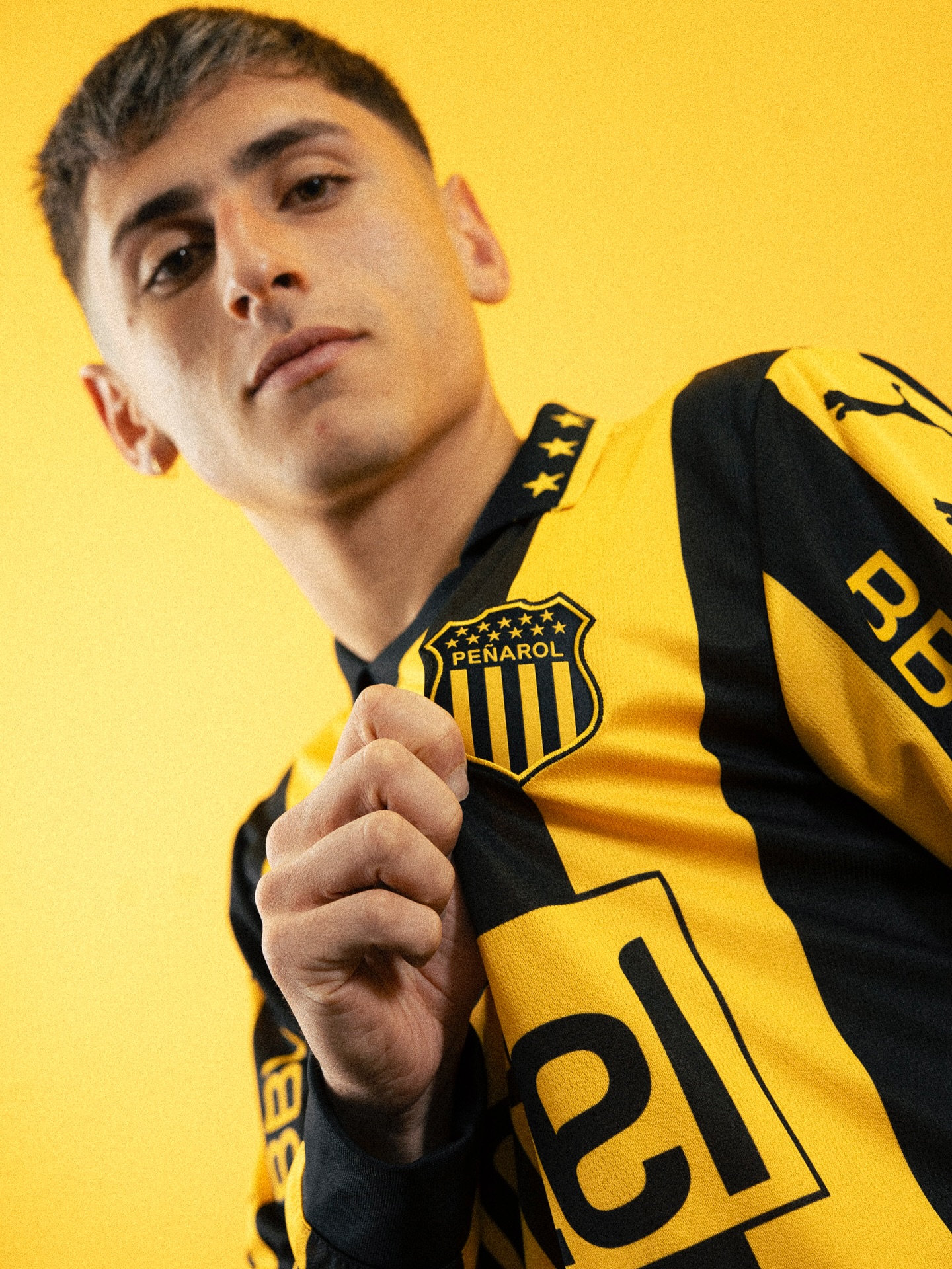 On the chest, the Peñarol crest is applied in yellow and black, maintaining its traditional form. Near the hem, a woven badge highlights Peñarol’s second Quinquenio de Oro, the achievement of winning five league titles in a row. This long sleeved edition honours the club’s foundation year and will be paired with black shorts and matching socks to form a full kit.