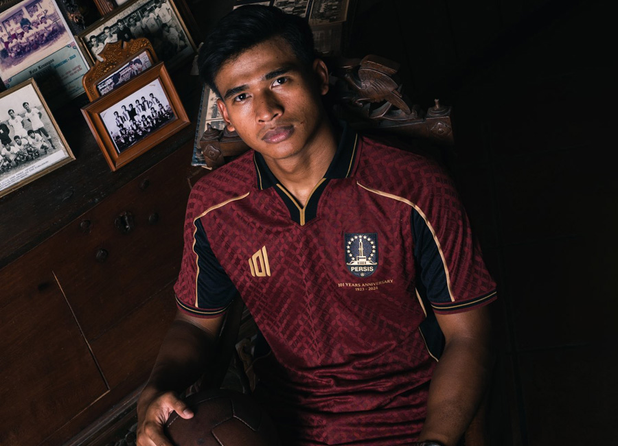 The 2024 birthday-celebrating release for the Indonesian BRI Liga 1 side is presented as being produced in-house, with a “101” graphic in the supplier logo position, and sees the history of “Laskar Sambernyawa” (“The Grim Reapers”) lauded by way of a jacquard-patterned design in tones of deep red augmented with black collar and panelling and gold trim.