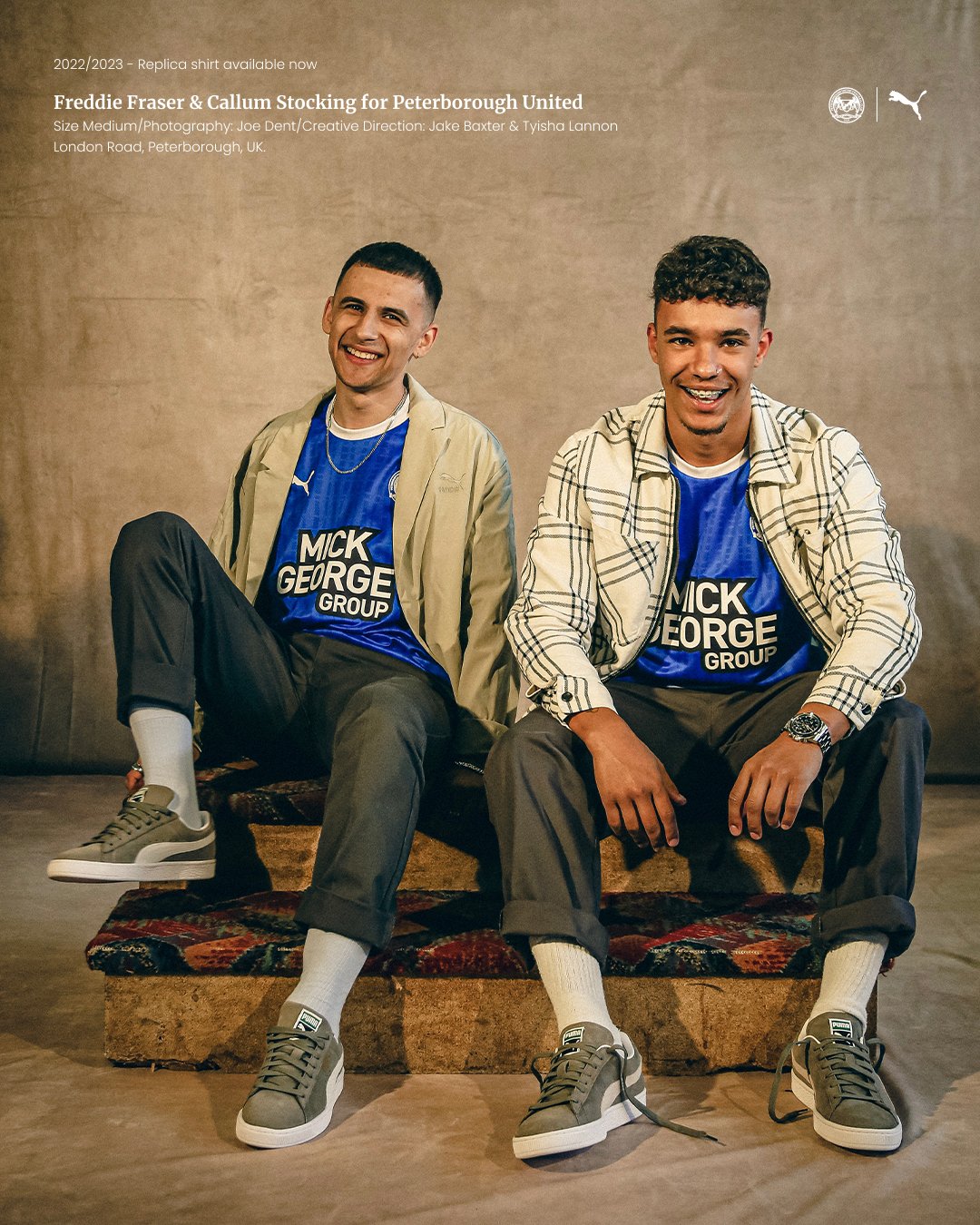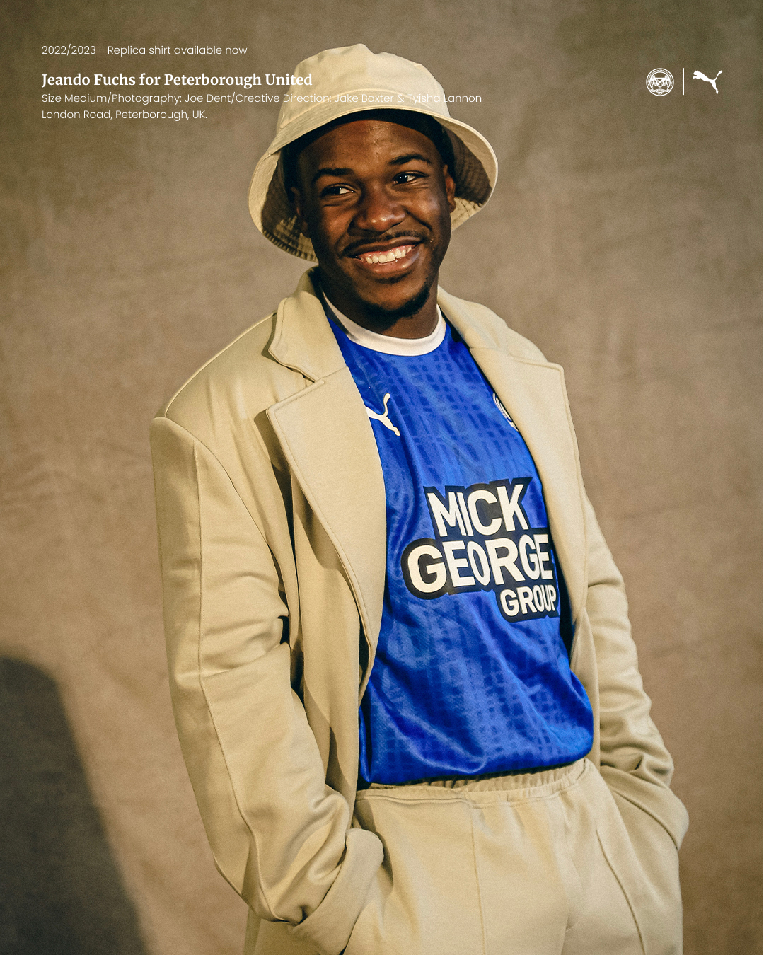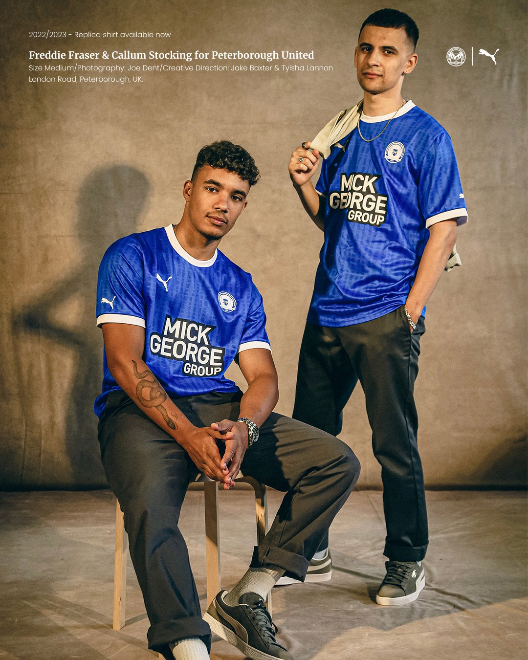 The 2022-23 “Posh” design is in tones of blue with the patterning of the base extending to the sleeves and the reverse, with white cuffs and stylised crew neck.