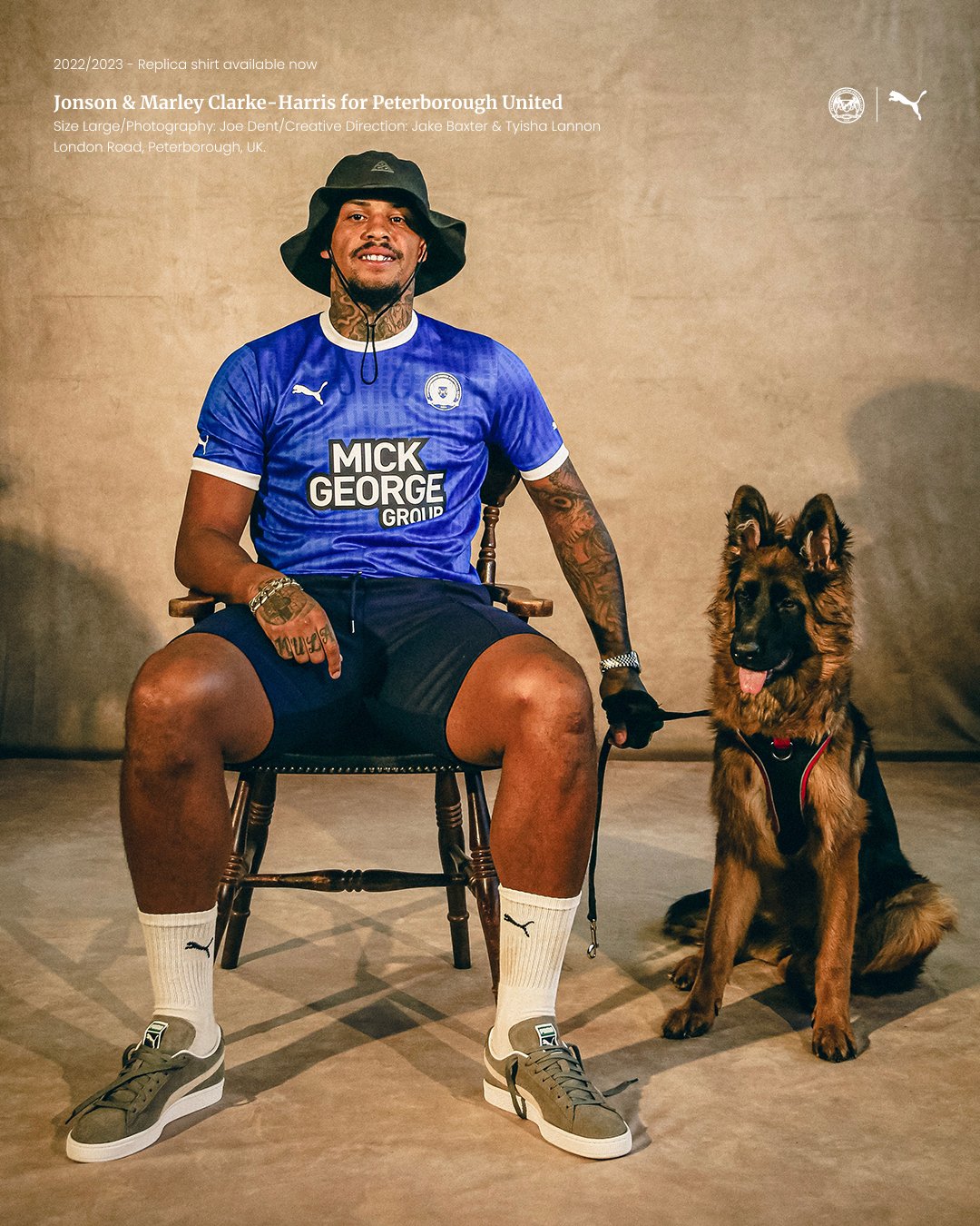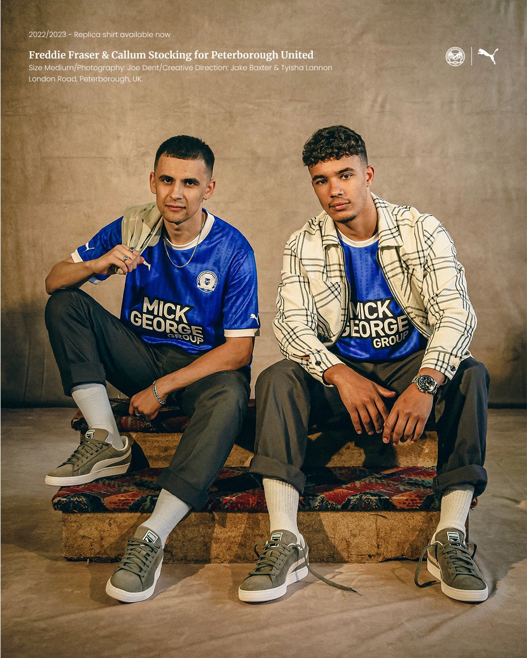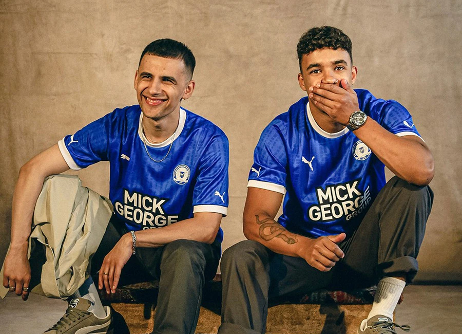 The 2022-23 “Posh” design is in tones of blue with the patterning of the base extending to the sleeves and the reverse, with white cuffs and stylised crew neck.
