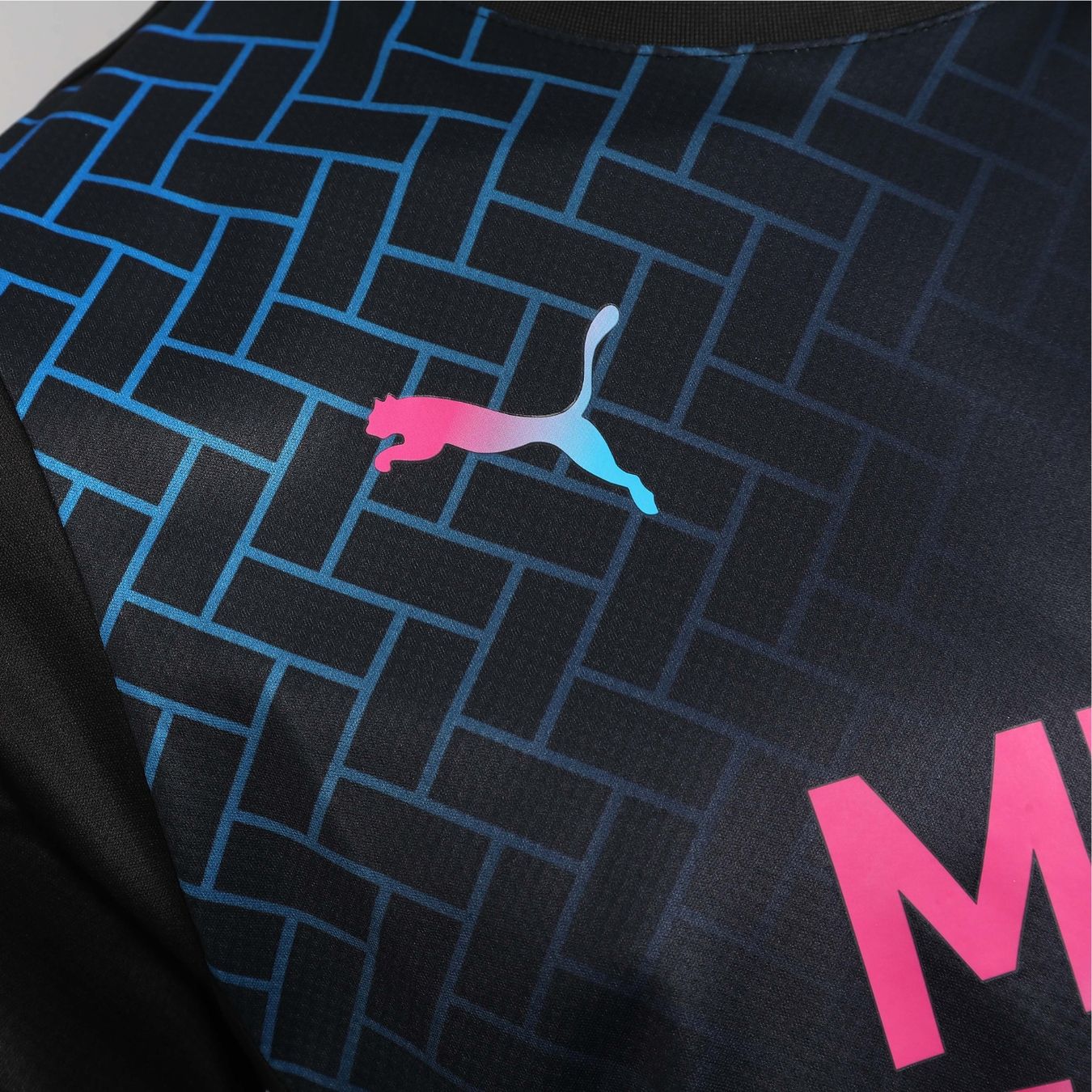 The new secondary-change design from Puma is in black with a blue pattern and the supplier “Cat” logos, the crest and the main sponsor branding all rendered in an iridescence-style blue merging into pink.