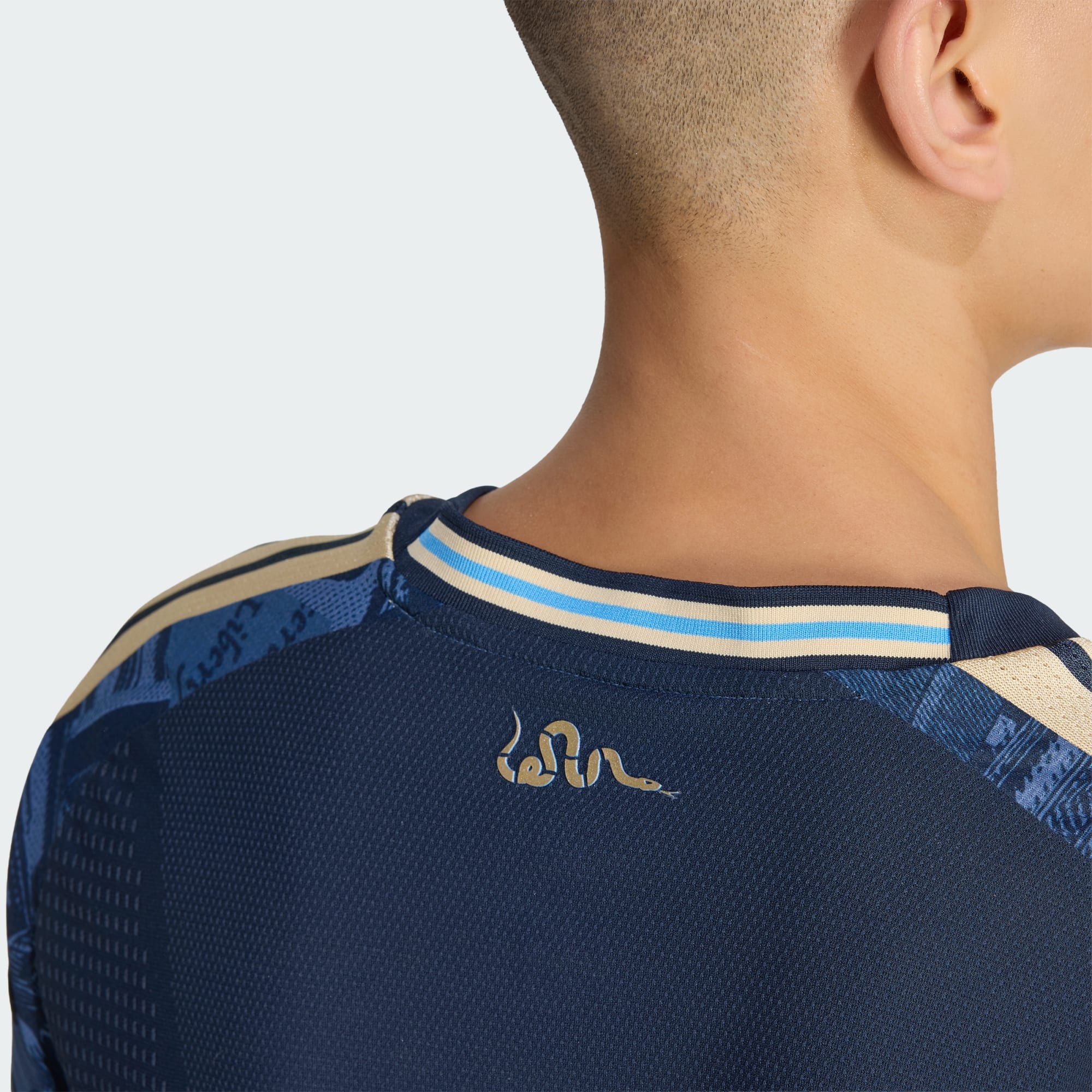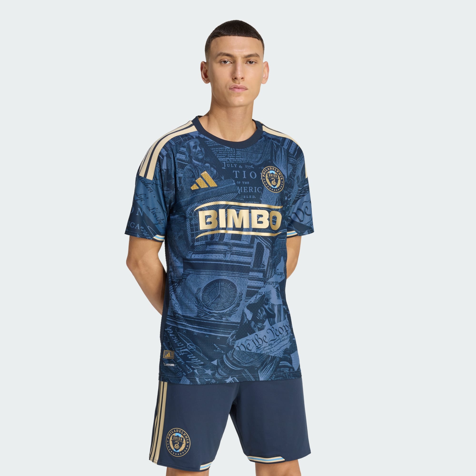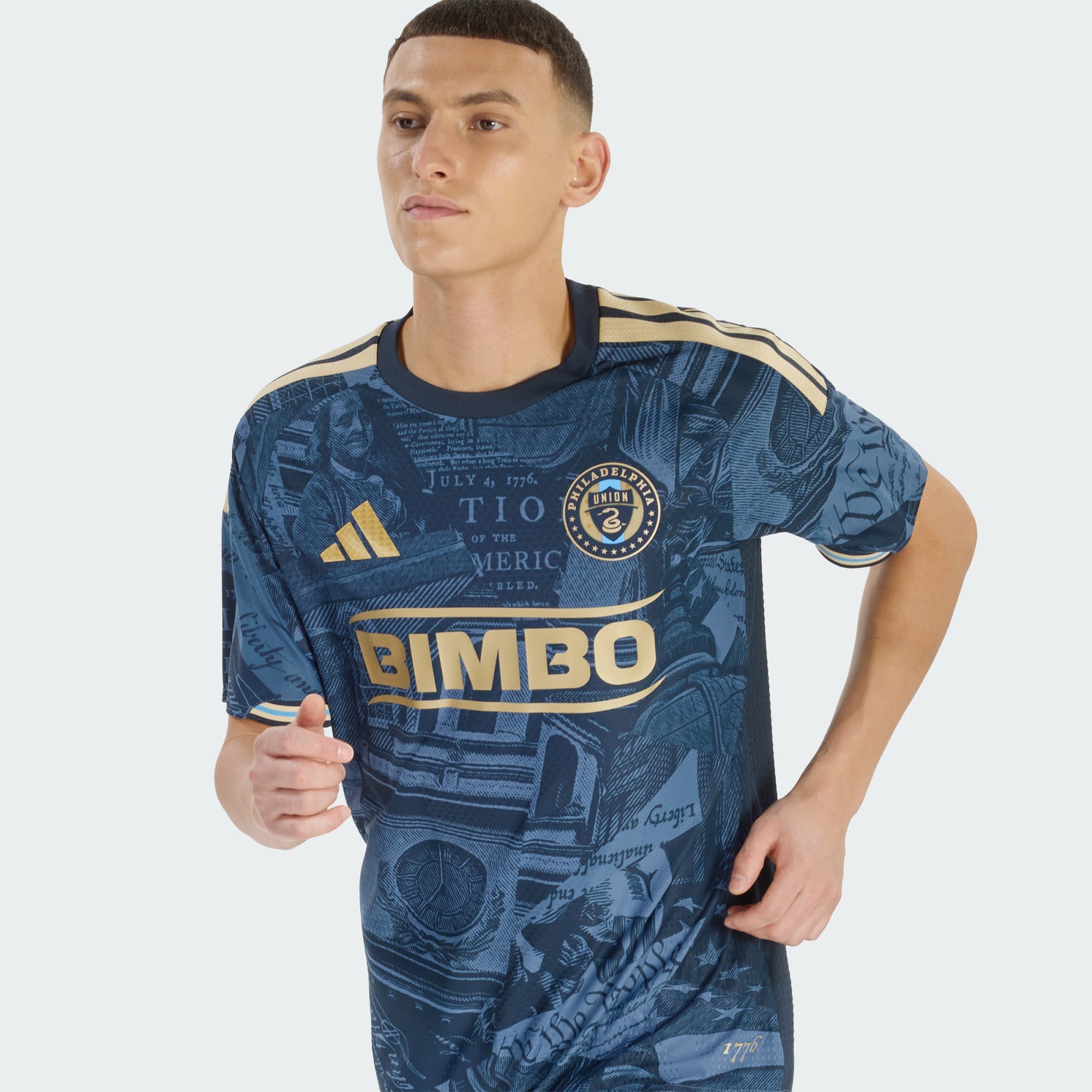 The new Philadelphia Union jersey is presented in a Night Navy base with gold detailing. The front panel features an all over tonal graphic incorporating historic Philadelphia references, including imagery linked to the Declaration of Independence, the Constitution, the Liberty Bell and Benjamin Franklin. Typography elements and architectural motifs are layered throughout the design, creating a continuous print across the body and sleeves.