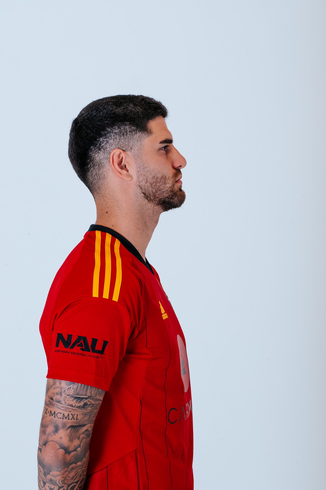 The 2022 design is in red with black pinstripes to the trunk, a black neck and manufacturer adidas’s branding in yellow.