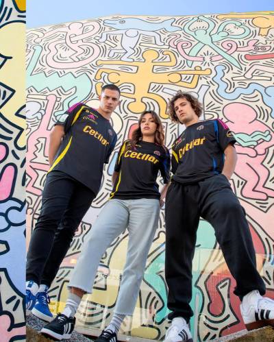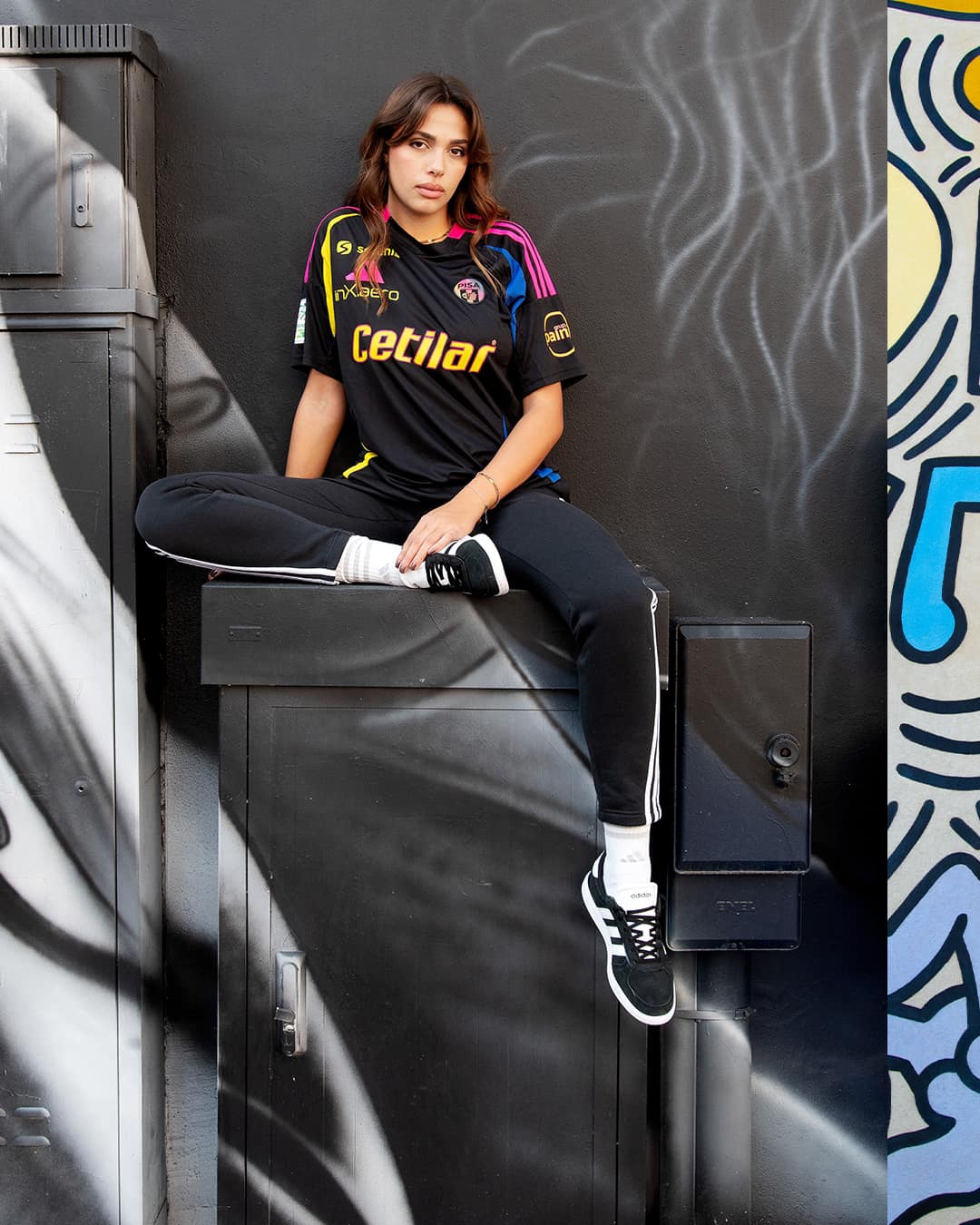 Completing the kit, black shorts and socks feature additional pink branding and yellow and blue details.