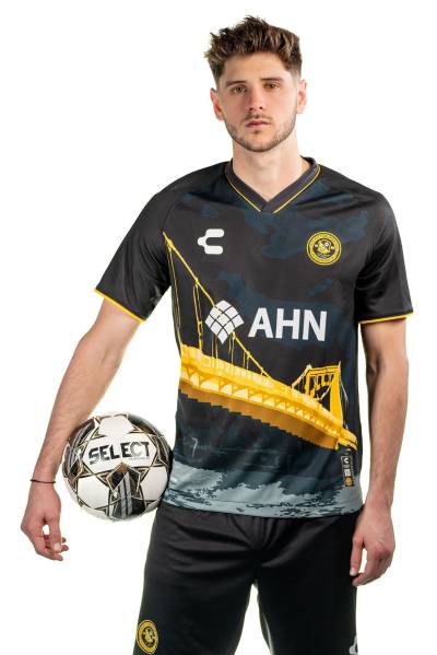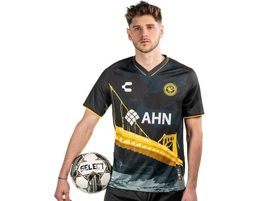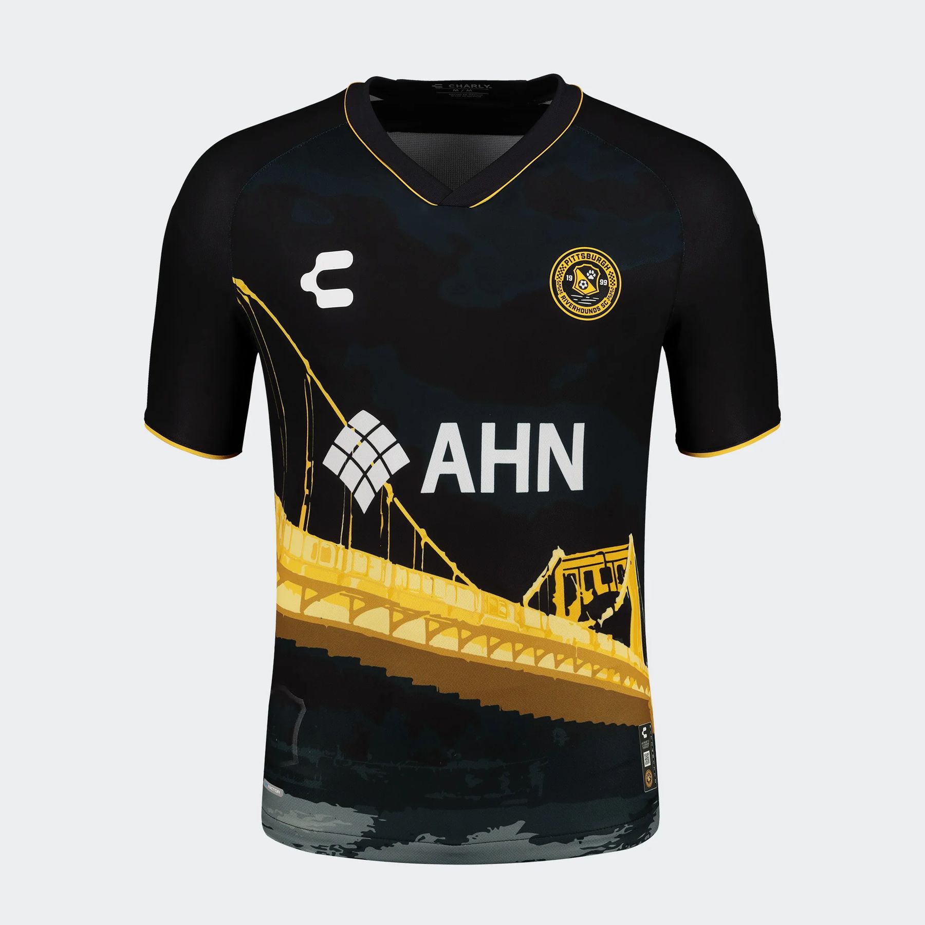 The American USL Championship side’s 2024 primary release is in black with a yellow graphical rendering nodding to the many bridges that grace the Pennsylvania city of Pittsburgh.
