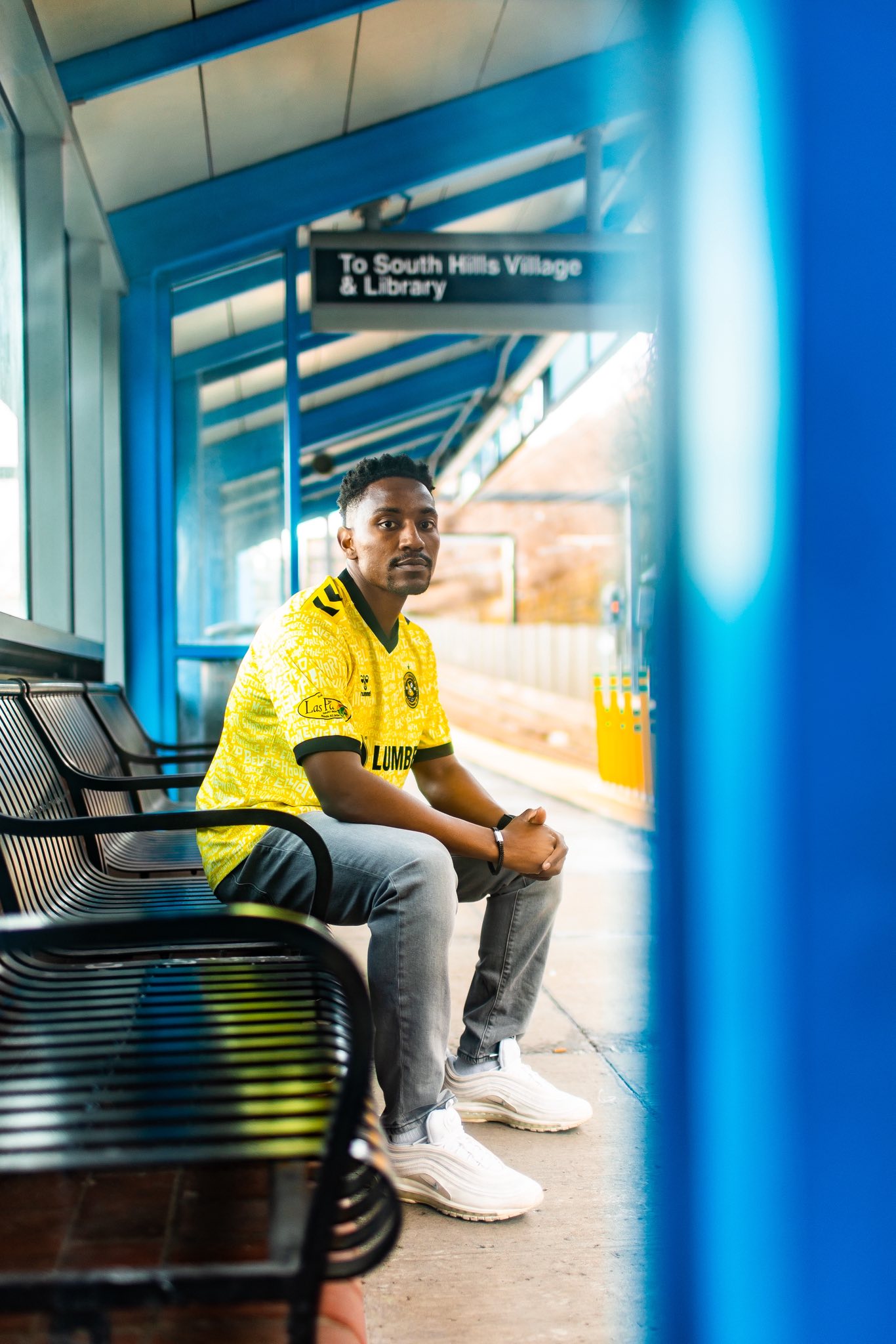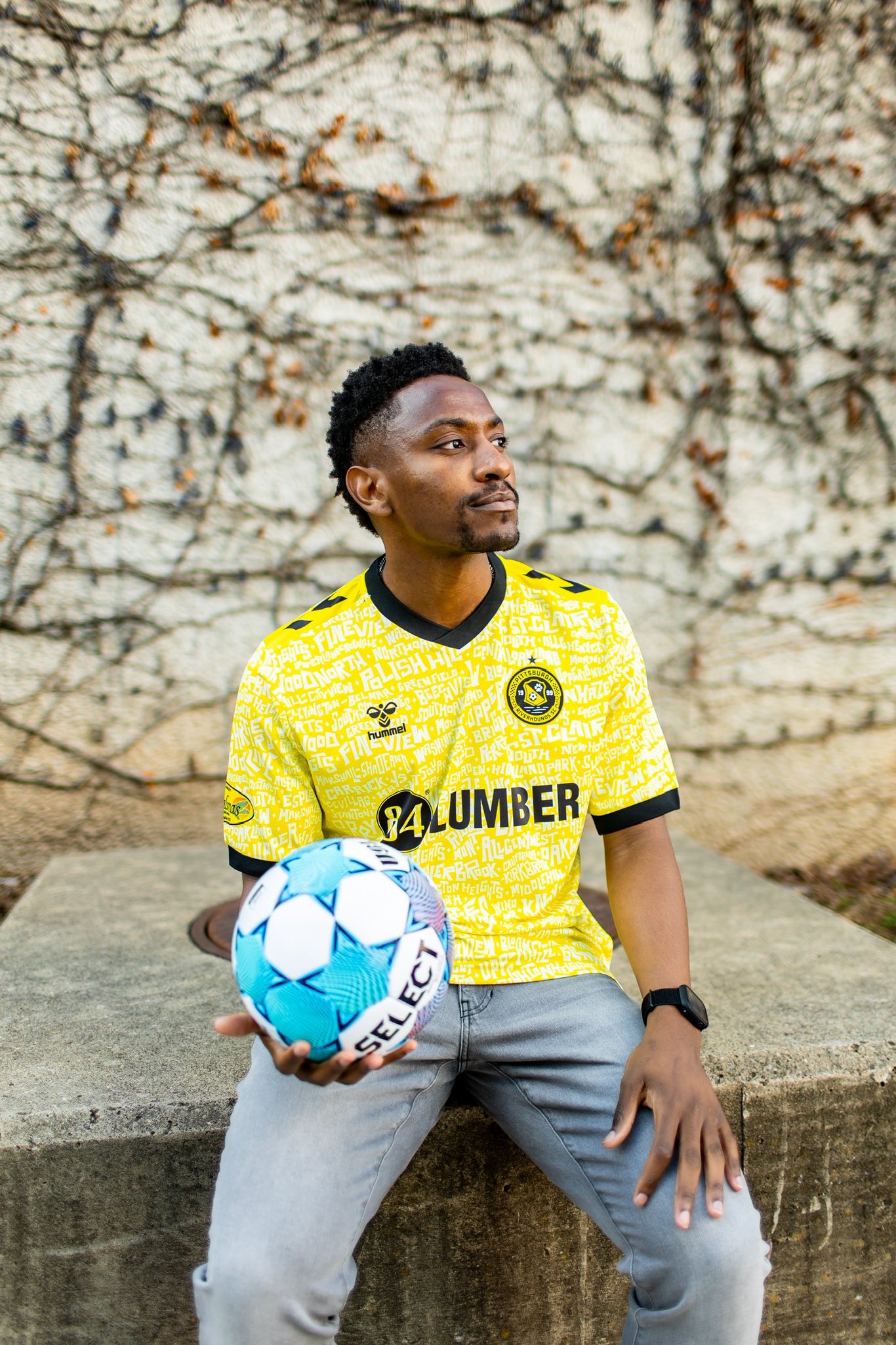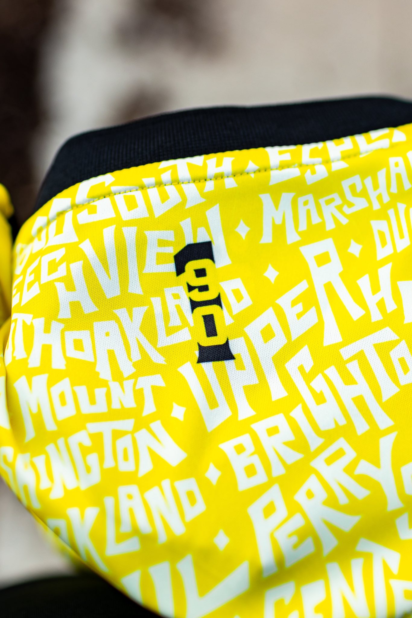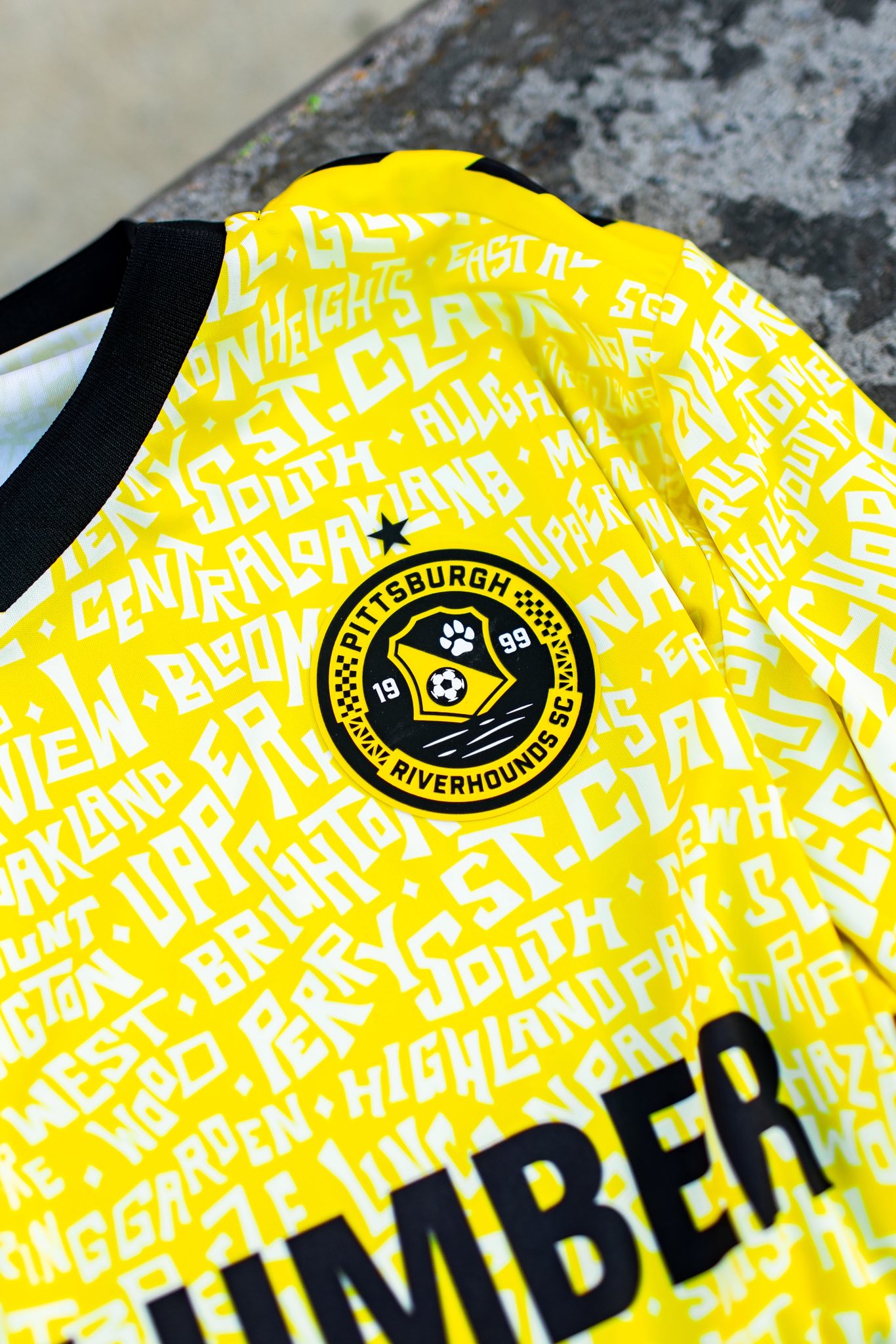 The new Pittsburgh Riverhounds jersey is presented in a Sunny Yellow base, reflecting one of the city’s established sporting colours. Across the entire shirt, a tonal text graphic incorporates the names of all 90 neighbourhoods of Pittsburgh, forming a layered typographic pattern sublimated into the fabric. Areas such as Brookline, Oakland, Mount Washington and South Side appear within the design, creating a city-wide map effect.