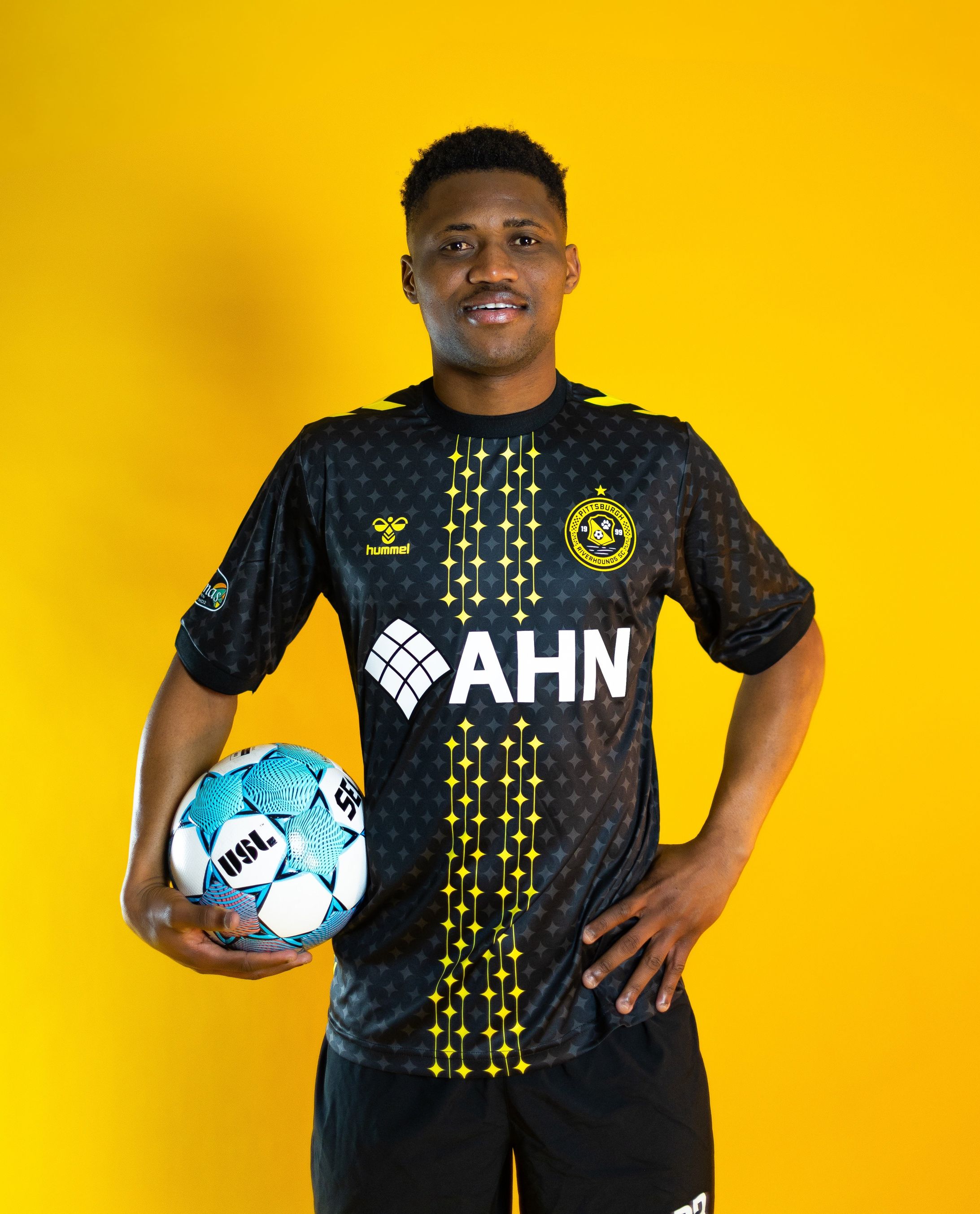 The new Pittsburgh Riverhounds jersey is presented in a black base with a tonal hypocycloid pattern applied across the fabric. Through the centre of the shirt, 90 individual yellow hypocycloids are aligned vertically to form a single stripe, referencing the 90 neighbourhoods that make up the city and combining them into one central column.