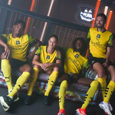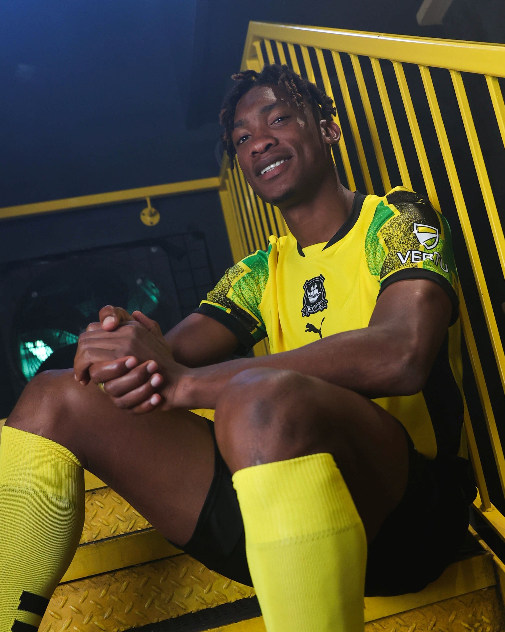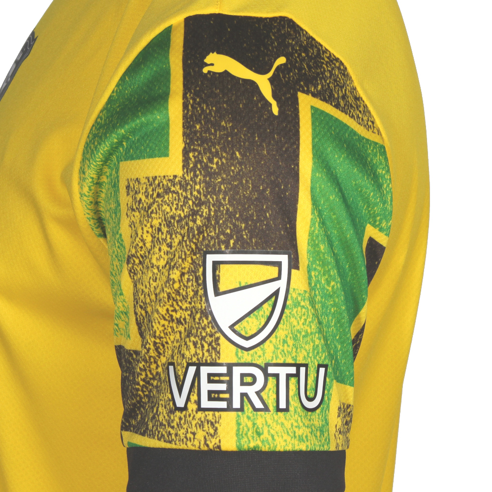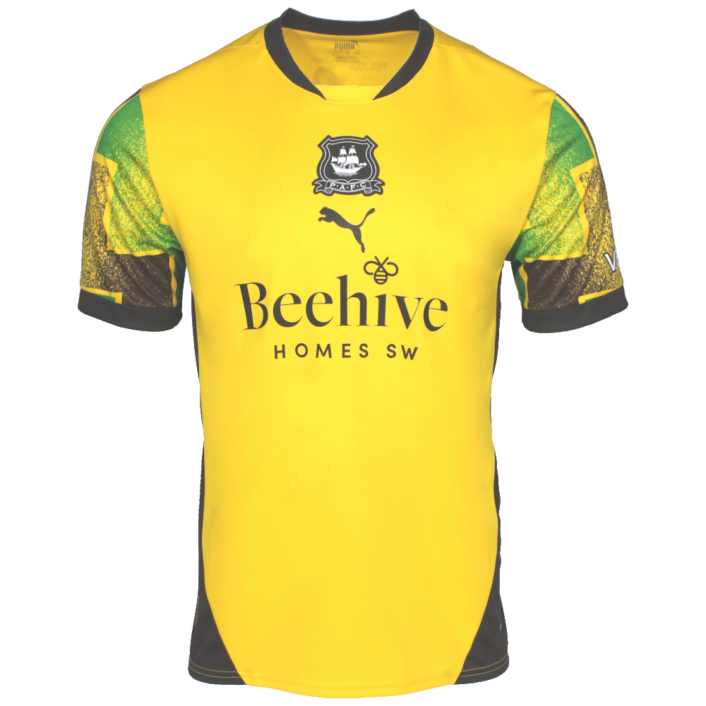 The 2024-25-season secondary-change release for the English EFL Championship’s “Pilgrims” is in yellow with green and black graphical embellishment on the sleeves to create a look that suggests the Jamaican national team.