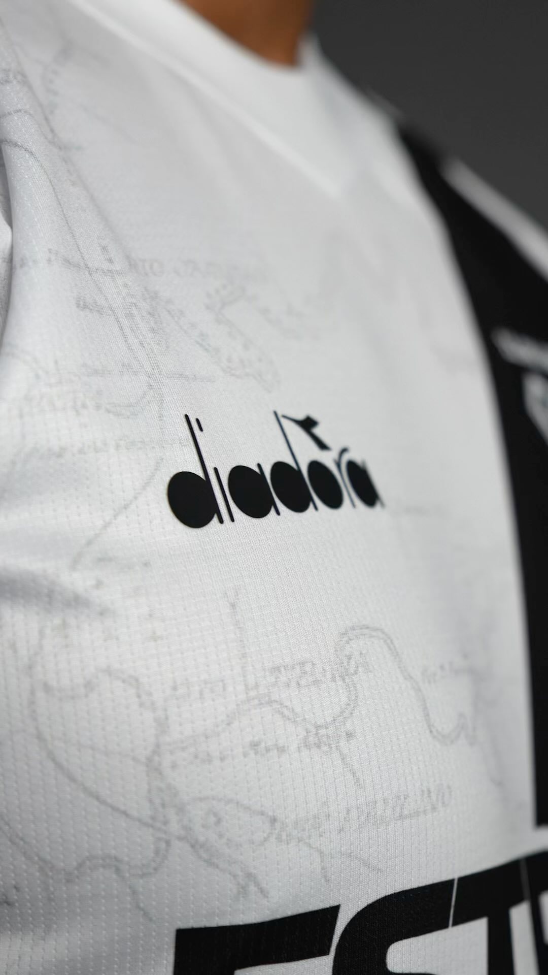 The new home shirt from Diadora is in white with a black sash running from left shoulder to right hip and this carries the club crest and is interrupted by sponsor/partner branding, while the change is essentially a reversal, with both designs carrying a subtle sublimated local map and coordinates of the club.