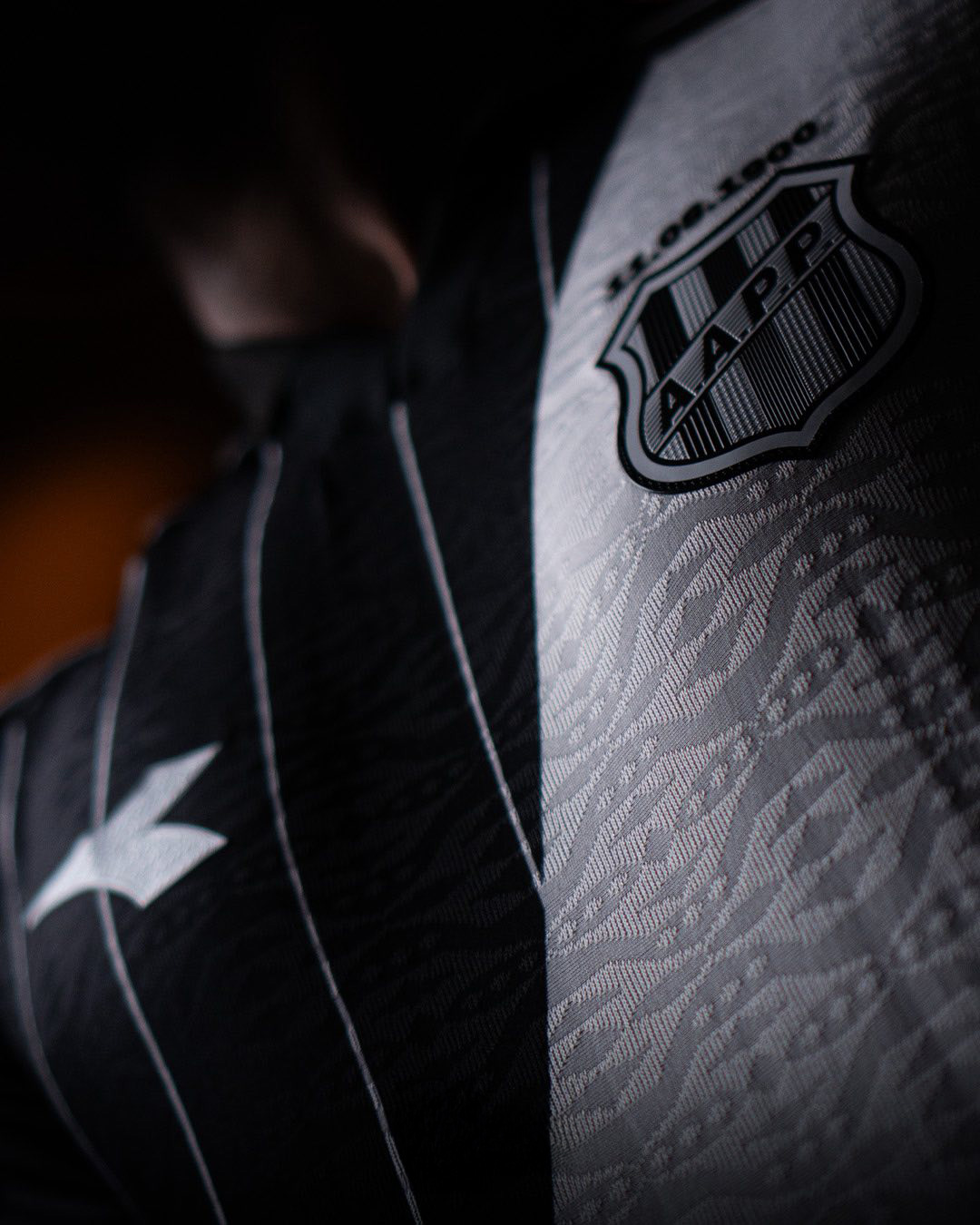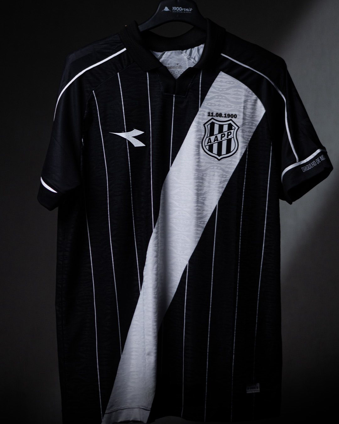 The new Ponte Preta jersey reverses the colour balance of the Home design, featuring a predominantly black base with a contrasting white diagonal sash running from the left shoulder to the right side of the torso. Thin vertical pinstripes appear across the front of the jersey, referencing classic chalk tailoring patterns.