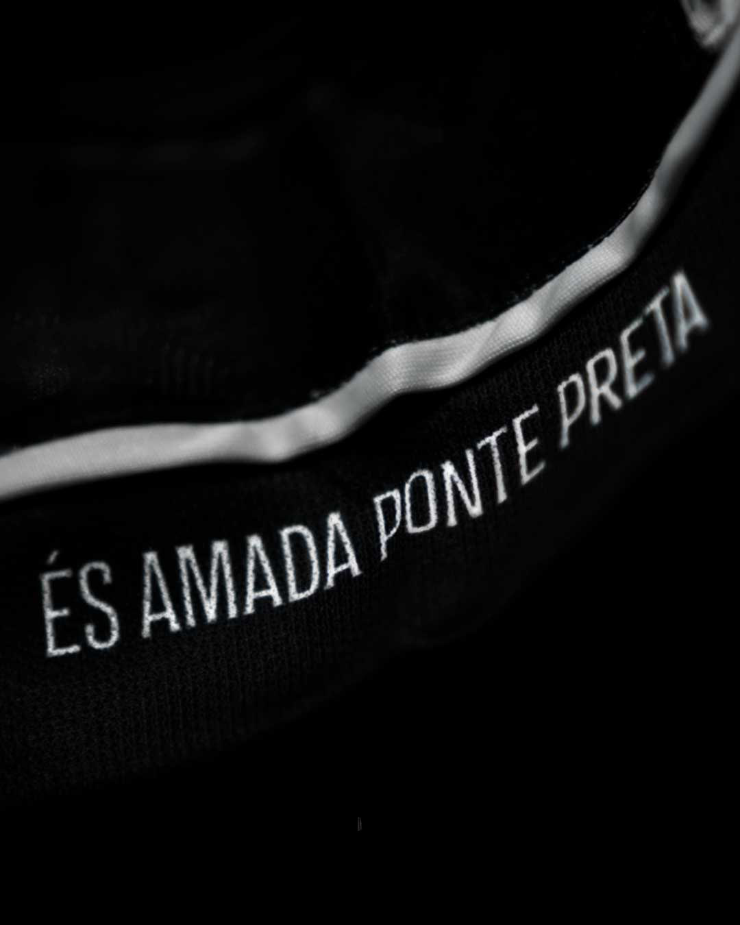 Additional details appear on the sleeve cuffs, including the phrase “És amada Ponte Preta” (“You are beloved Ponte Preta”), taken from the club anthem. Another sleeve inscription reads “Orgulho de nossa terra” (“Pride of our land”). A Diadora Official Product tag is applied near the hem. The new Ponte Preta football shirt is completed with matching black shorts and socks for the full 2026 Brazilian football season uniform.