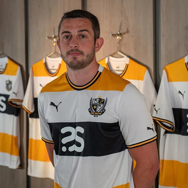 The new Port Vale FC home shirt proudly showcases the traditional colours of the club - white, black, and amber. It features a sleek round-neck collar and shirt cuffs in striking black and amber. The kit is complemented by black shorts and classic white socks, completing the stylish and sophisticated look.