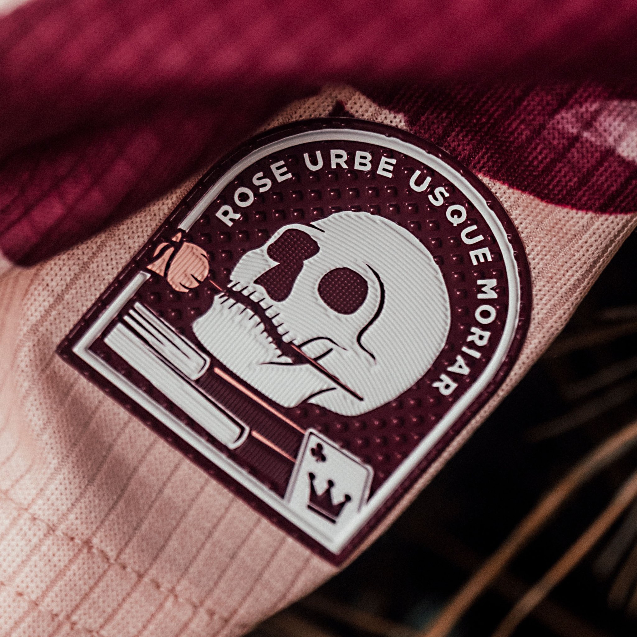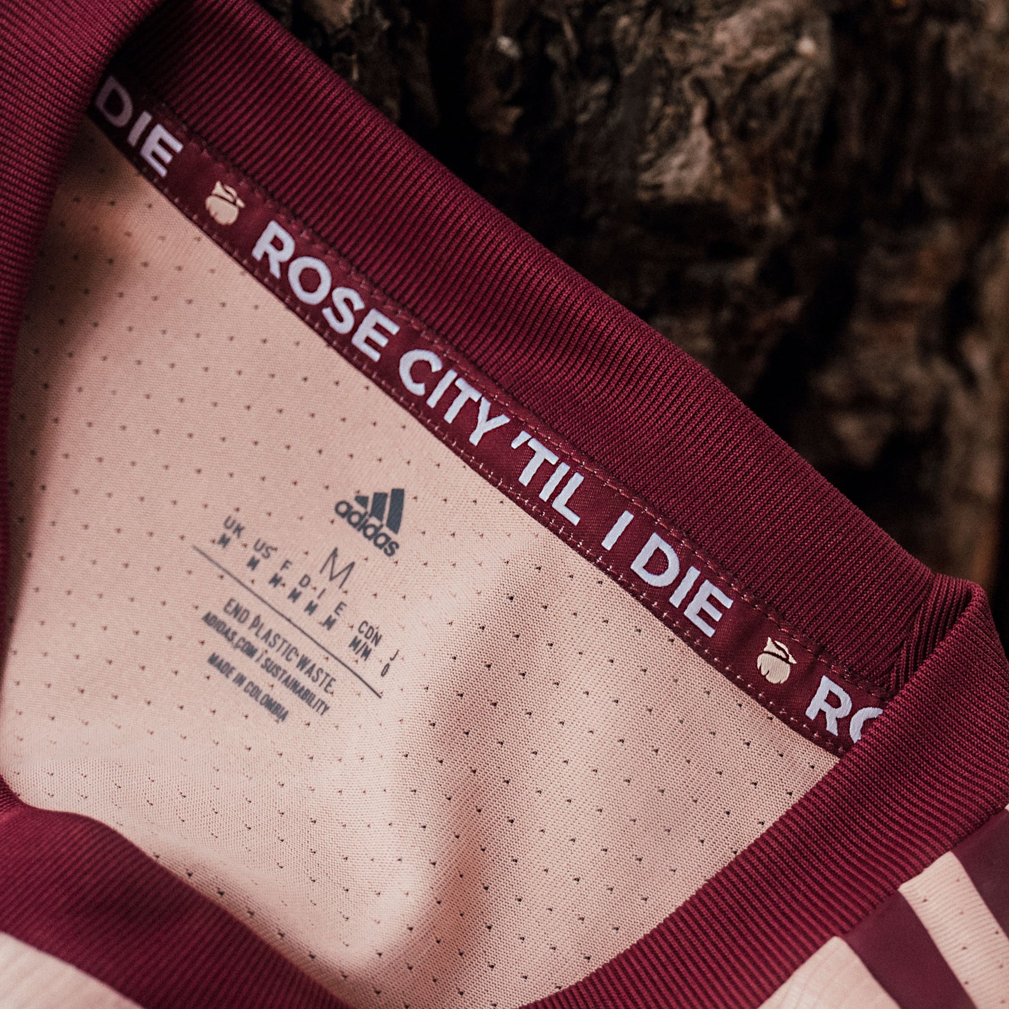 The jersey base is rooted in “Vapour Pink,” with accents in “Victory Crimson” across the collar, shoulder and sleeve cuffs. The design is a vibrant, rose-themed kit – an ode to The Rose City.