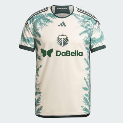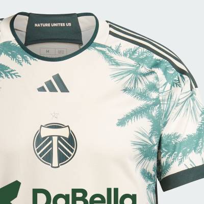 This secondary kit, the club's 17th since it entered the MLS in 2011, features a unique hand-drawn leaf pattern that pays homage to Oregon's native trees. It is accented with shadow green trim on the cuffs, neck, and sides, linking it to the club's Portland Plaid kit, and includes logos, names, and numbers set against a halo ivory background.