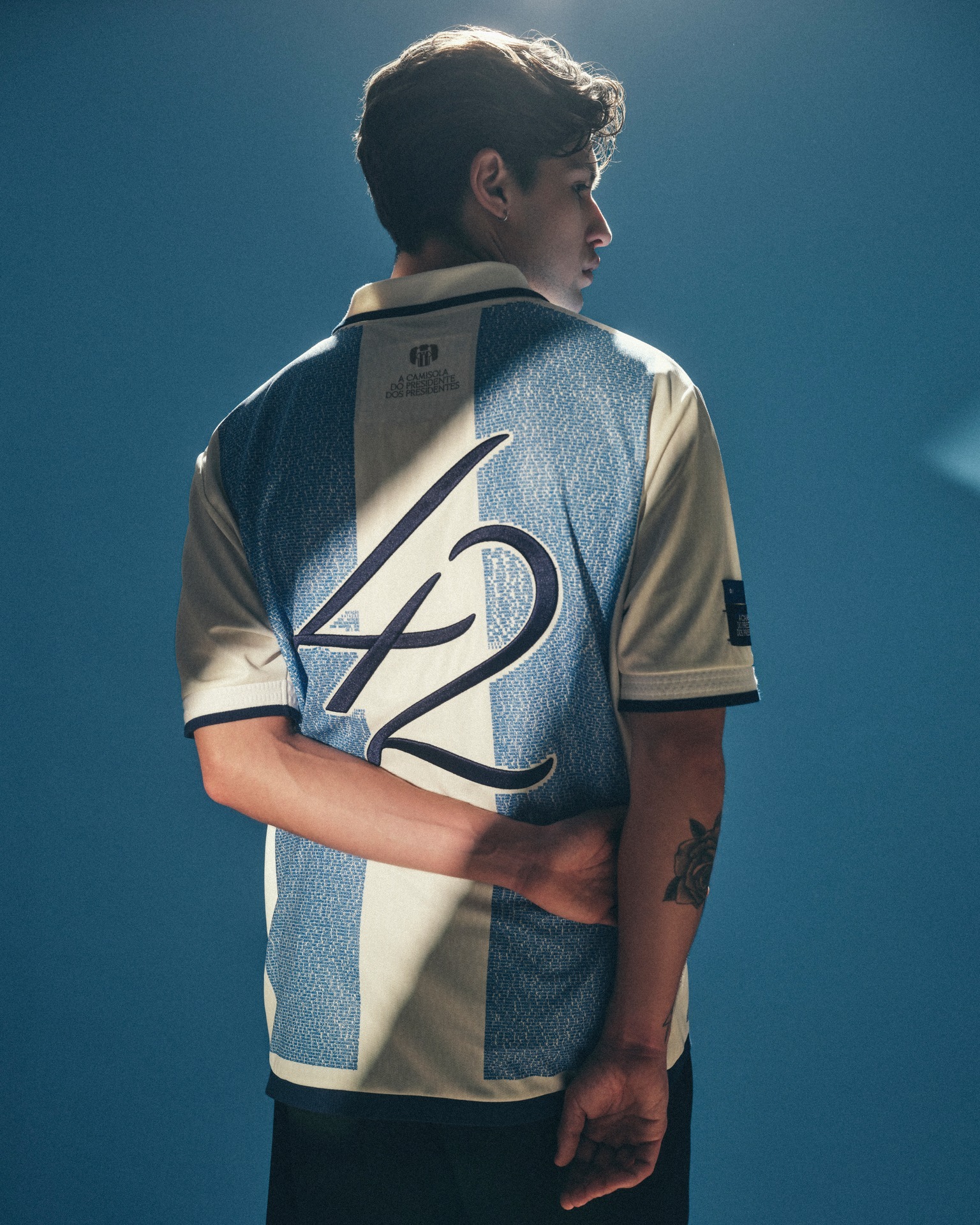 Limited edition to 2,594 units, the new FC Porto jersey adopts a traditional blue and white vertical stripe layout, combined with a classic fold over polo collar and short sleeves. Each blue stripe is constructed from micro text detailing every official title secured during Pinto da Costa’s presidency, referencing the 2,594 trophies won across multiple sports including football, basketball, handball and swimming. The typography forms the visual texture of the stripes, embedding the club’s honours directly into the fabric design.