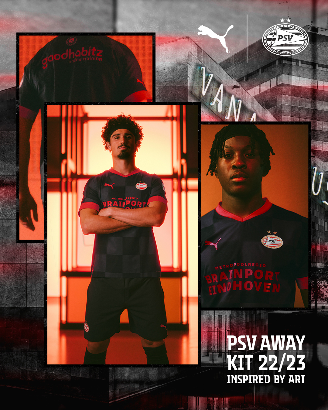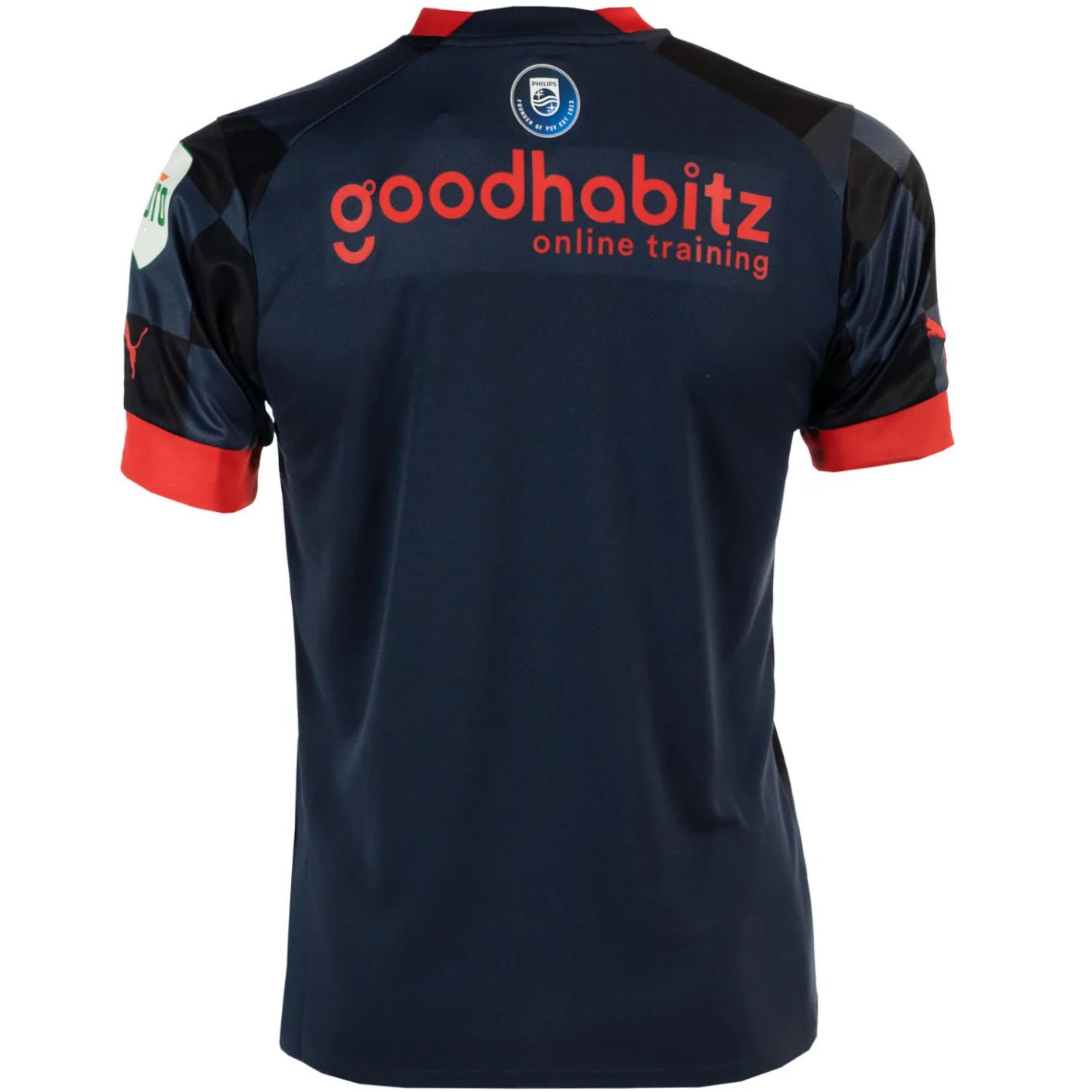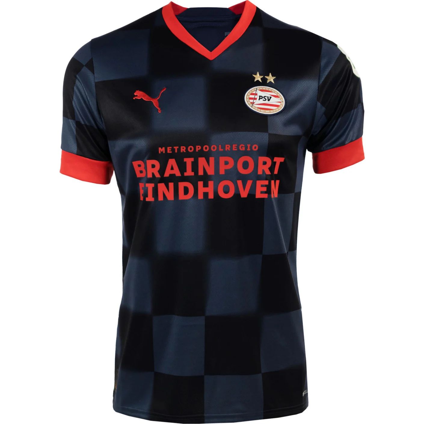 The new PSV away shirt has a chequered pattern in the ‘Parisian Nights’ colours and features bright red details such as the Puma cat, main sponsor Metropoolregio Brainport Eindhoven and back of shirt sponsor GoodHabitz.