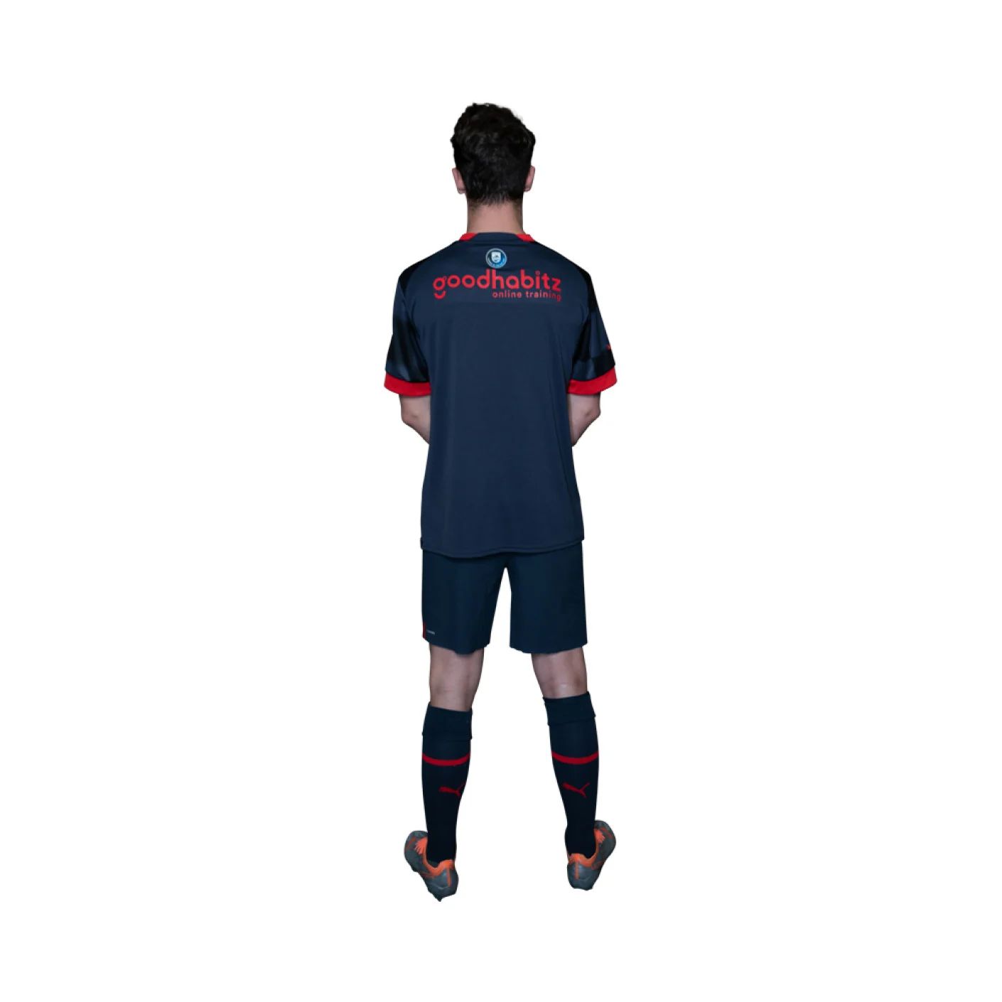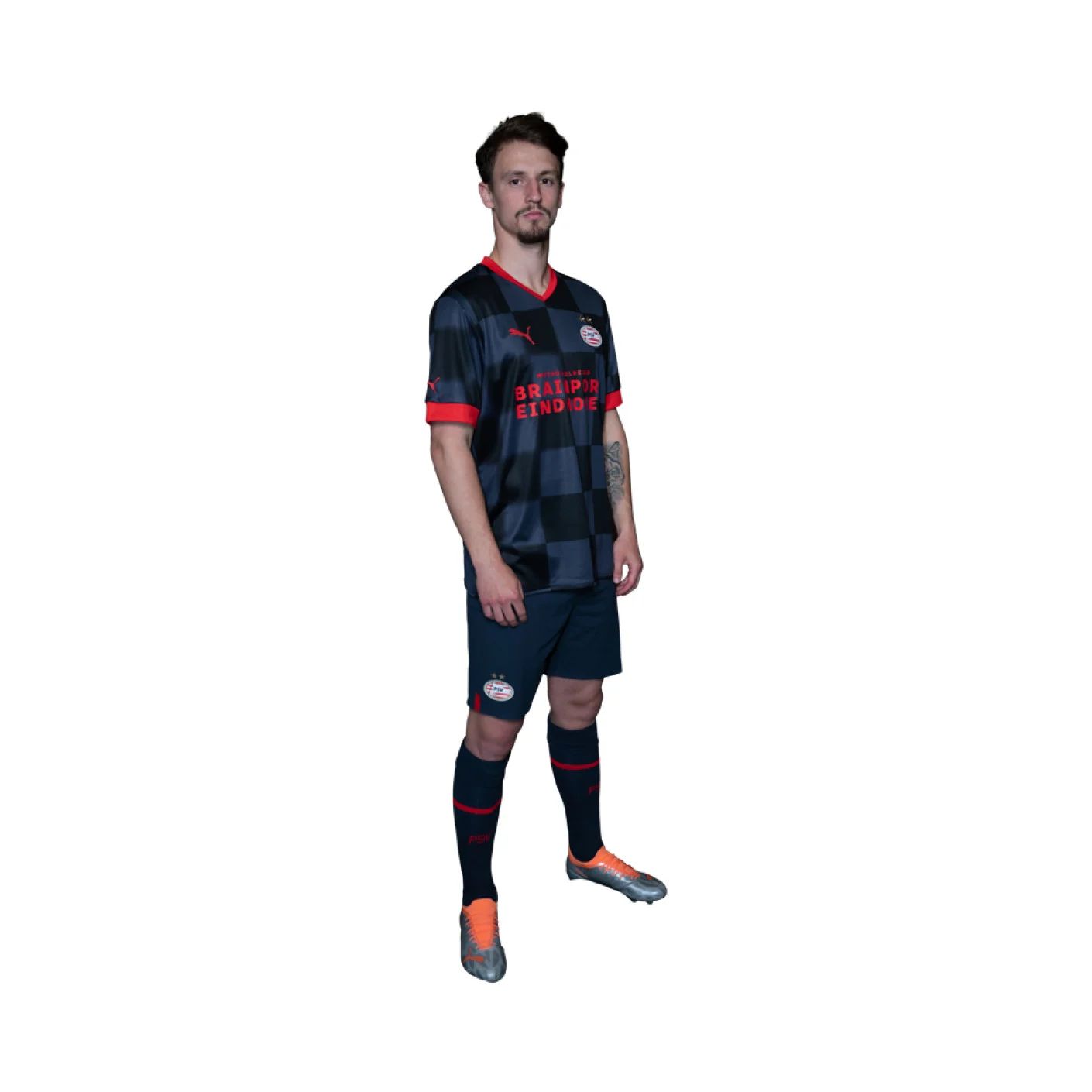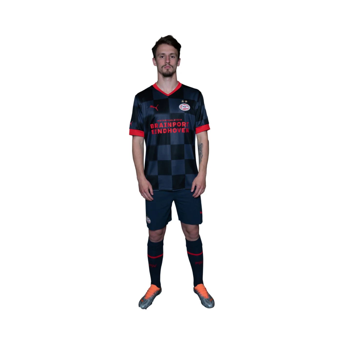 The new PSV away shirt has a chequered pattern in the ‘Parisian Nights’ colours and features bright red details such as the Puma cat, main sponsor Metropoolregio Brainport Eindhoven and back of shirt sponsor GoodHabitz.