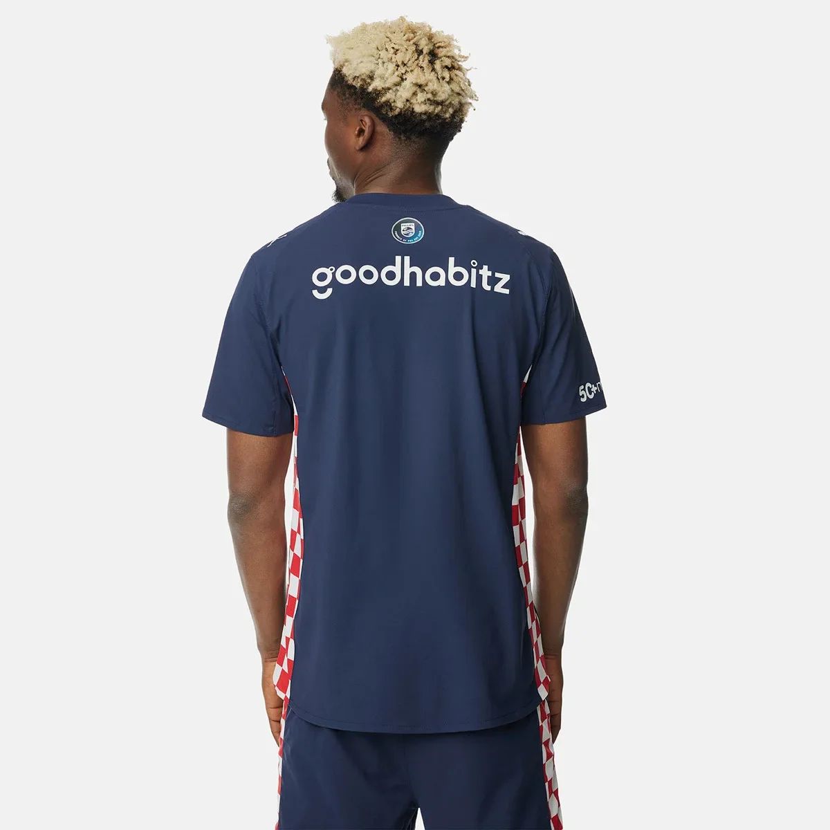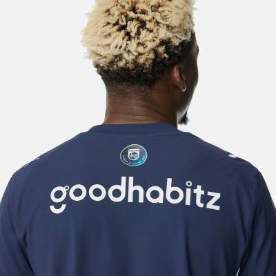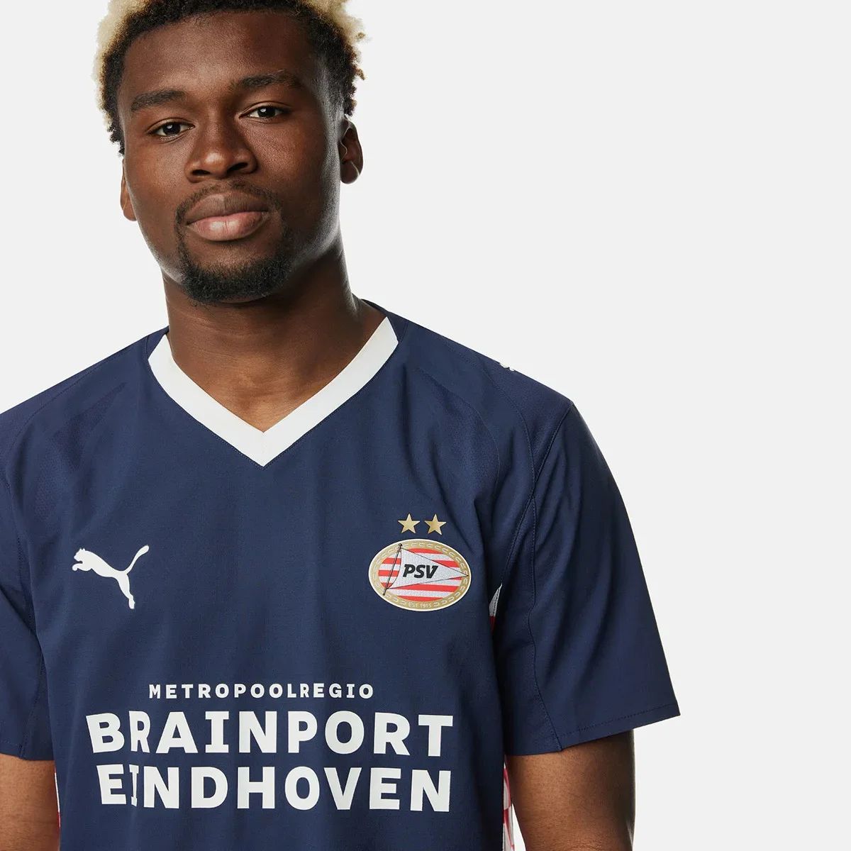 The main sponsor, Brainport Eindhoven, features in white on the front of the shirt, with Goodhabitz branding on the upper back. The bottom of the shirt includes a PUMA authenticity tag. The shirt will be paired with matching navy shorts and socks to form a full kit.