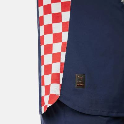 The Puma shirt is navy blue and features a two-part collar design, with a white V-neck front section and navy back and side panels that blend with the main body of the shirt.