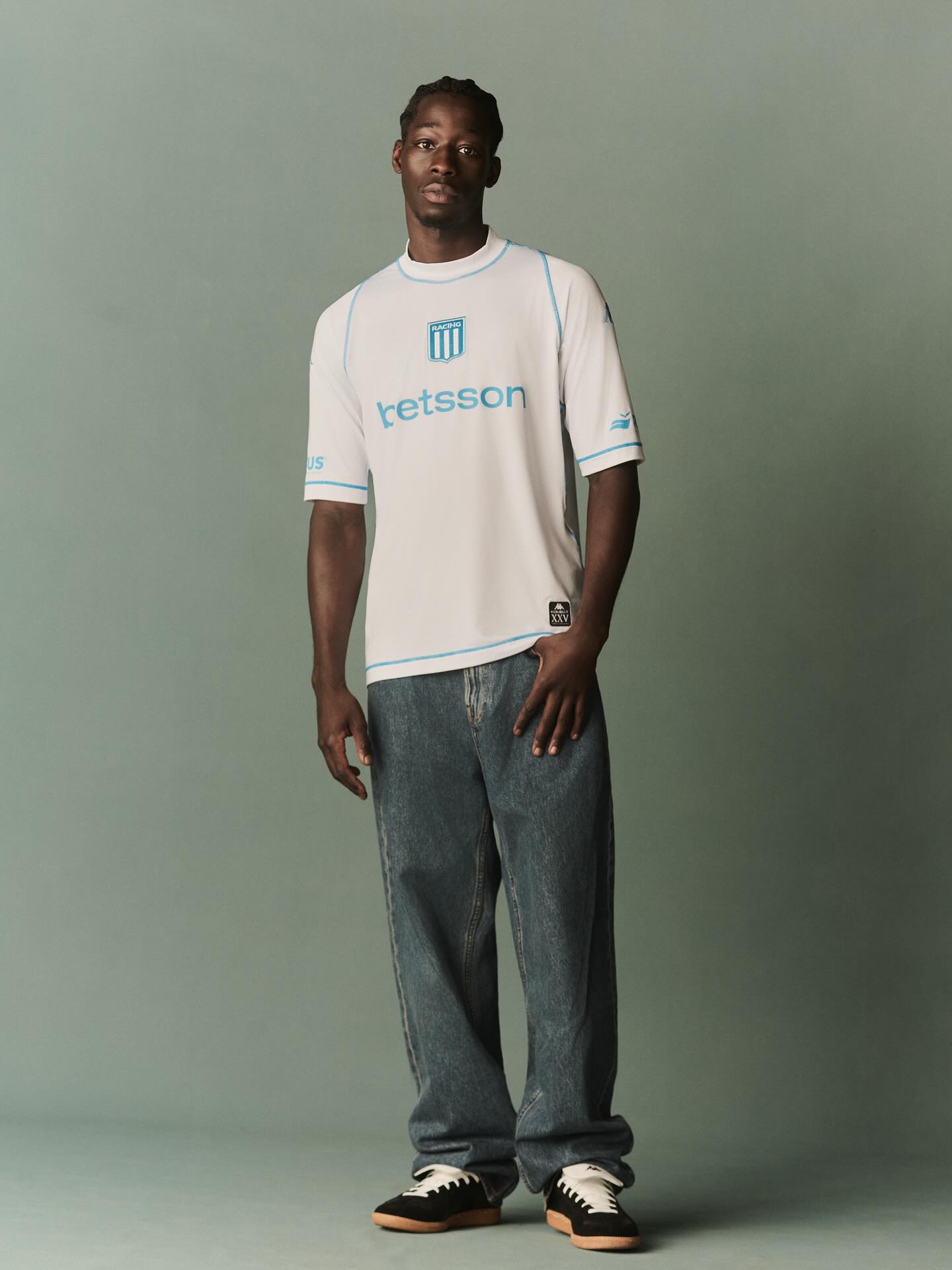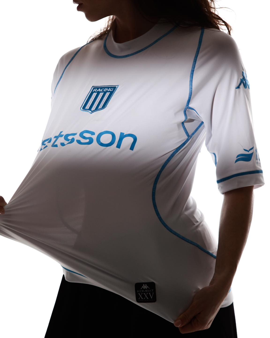 The new jersey features a minimalist white base with light blue detailing, including the Kappa logos, club badge, and sponsor branding. The tight-fitting cut references the original 2000 silhouette, offering the same second-skin comfort that defined the Kombat line at its debut.