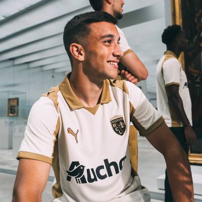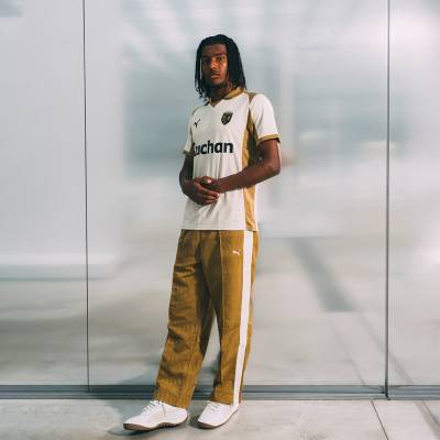 Constructed using Puma’s RE:FIBRE recycling process and containing at least 95 percent recycled textile material, the jersey features dryCELL technology for moisture control and is paired with matching gold shorts and socks to form a full kit.