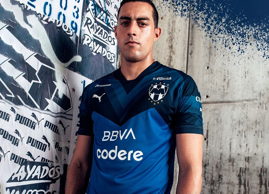Although the initial of the club’s name and of the club’s city’s name is created, the design is actually a reference to the nearby Cerro de la Silla twin-peaked mountain, with the Rayados crest and the cat logo of the German manufacturer overlaid and incorporating the addition of white to the palette.